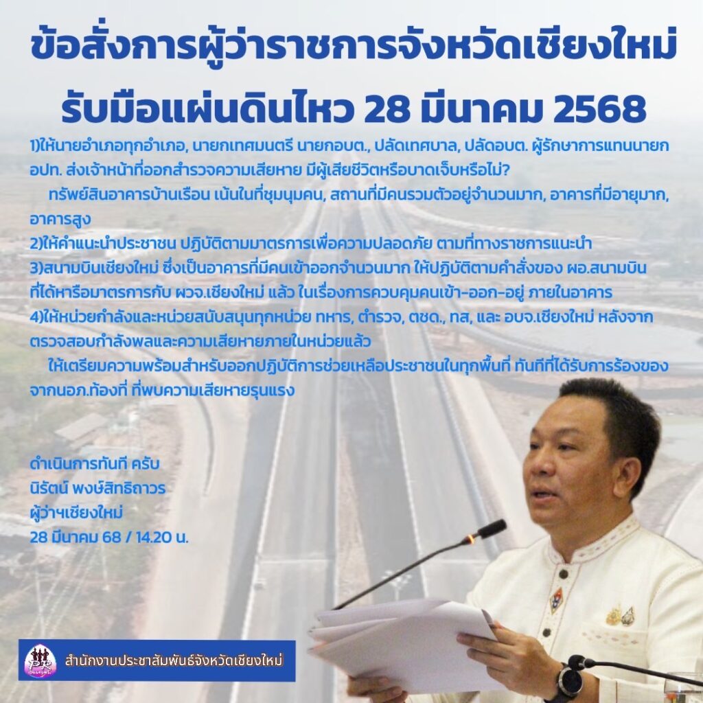 ผู้ว่าฯ เชียงใหม่ สั่งเร่งสำรวจความเสียหาย และช่วยเหลือประชาชนจากเหตุแผ่นดินไหว