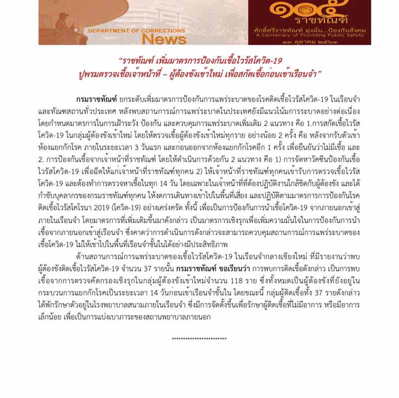 กรมราชทัณฑ์ ยกระดับเพิ่มมาตรการป้องกันการแพร่ระบาดของโรคติดเชื้อ โควิด19 ในเรือนจำและทัณฑสถานทั่วประเทศ หลังพบสถานการณ์การแพร่ระบาดในประเทศยังมีแนวโน้มการระบาดอย่างต่อเนื่อง