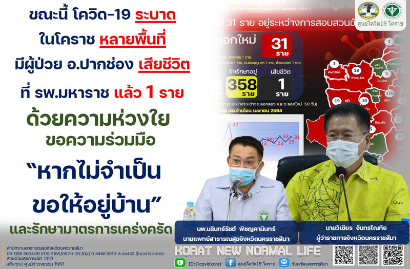 สำหรับสถานการณ์การแพร่ระบาดของไวรัสโควิด-19ในพื้นที่จังหวัดนครราชสีมา วันนี้พบผู้ป่วยติดเชื้อเพิ่ม 31 ราย รวมมียอดผู้ป่วยสะสม 384 ราย รักษาหาย 25 ราย ยังรักษาอยู่ 258 ราย