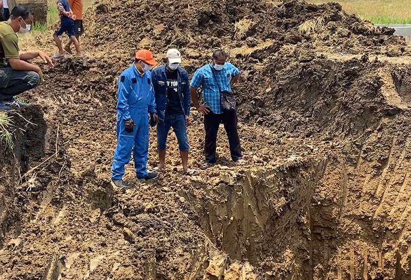 ด้าน นายสุเทพ หาดแก้ว อายุ 52 ปี เพื่อนร่วมงาน เล่าว่า ก่อนเกิดเหตุ เจ้าของนาได้ว่าจ้างให้ลงไปเพื่อต่อท่อหาตาน้ำบาดาล ซึ่งขณะนั้นรถแบคโฮ ได้ขุดดินลึกลงไปแล้วกว่า 5 เมตร ซึ่งตอนนั้นกำลังเตรียมจะนำวงรอง ซีเมนต์ ลงไป แต่จู่ๆดินปากบ่อเกิดสไลด์ตัวลงไป ทับร่างของเพื่อนร่วมงานที่กำลังทำงานอยู่ในบ่อ ตอนนั้นตนเองขึ้นมาผสมปูน เลยวิ่งไปดูที่บริเวณปากบ่อ พร้อมกับเจ้าของนา ดินก็เกิดสไลด์ตัวลงไปอีก ทำให้ตนและเจ้าของนาตกลงไปด้วย ซึ่งเจ้าของนาและเพื่อคนงาน ได้รับบาดเจ็บถูกนำตังส่ง รพ. ส่วนตนเองได้รับบาดเจ็บเพียงเล็กน้อย ก็เลยช่วยกันตะเกียกตะกายขึ้นจากบ่อ แต่ก็ต้องสลดใจเพราะมีเพื่อนคนงานอีก 1 คน ถูกดินทับร่างไม่สามารถช่วยเหลือได้ เลยรีบทำการโทรแจ้งเจ้าหน้าที่ให้เข้ามาทำการช่วยเหลือ