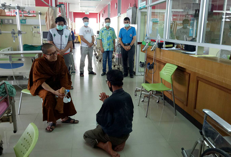 ซึ่งเจ้าหน้าที่ตำรวจ เจ้าหน้าที่โรงพยาบาล และหน่วยงานที่เกี่ยวข้องพยายามเกลี้ยกล่อมนานกว่า 2 ชั่วโมง แต่ก็ไม่ยอมลง พร้อมบอกว่าจะฆ่าตัวตาย อยากบวช และอยากเจอพระจึงจะยอมลง เจ้าหน้าที่จึงใช้ถุงสูบลมรองไว้ข้างล่าง เพื่อป้องกันการกระโดดลงมา และทางผู้อำนวยการโรงพยาบาลได้ให้ไปนิมนต์พระจากวัดใกล้เคียงมาช่วยเกลี้ยกล่อม สุดท้ายชายคนดังกล่าวเมื่อเจอพระตามที่ร้องขอจึงยอมปีนกลับเข้ามาอย่างปลอดภัย ท่ามกลางความโล่งอกโล่งใจของเจ้าหน้าที่