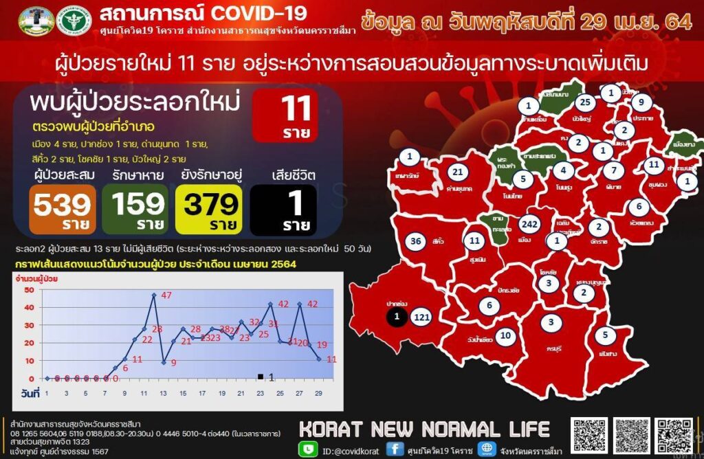 นายวิเชียร จันทรโณทัย ผู้ว่าราชการจังหวัดนครราชสีมา กล่าวถึงสถานการณ์การแพร่ระบาดของเชื้อไวรัสโควิด-19 ในพื้นที่จังหวัดนครราชสีมา ว่า ล่าสุดวันนี้ (29 เมษายน 2564) พบ ผู้ติดเชื้อโควิด-19 เพิ่มขึ้น 11 ราย พบในพื้นที่ อ.เมือง 4 ราย อ.ปากช่อง 1 ราย อ.ด่านขุนทด 1 ราย อ.สีคิ้ว 2 ราย อ.โชคชัย 1 ราย และ อ.บัวใหญ่ 2 ราย รวมมียอดผู้ป่วยสะสม 539 ราย รักษาหาย 159 ราย ยังรักษา 379 ราย เสียชีวิต 1 ราย ยังคงพบการระบาดใน พื้นที่ 27 อำเภอจาก 32 อำเภอของจังหวัดนครราชสีมา สำหรับข้อมูล รพ.สนาม มีผู้ป่วย 35 ราย แบ่งเป็นชาย 18 ราย หญิง 17 ราย คงเหลือเตียงว่างในรพ.สนาม 65 เตียง ข้อมูลการตรวจรถชีวนิรภัยพระราชทาน ตรวจหาเชื้อรายใหม่จำนวน 1,817 ราย เป็นผู้รับการสะสม 7,170 ราย ไม่พบเชื้อ 7,138 ราย รอผล 18 ราย พบเชื้อ 14 ราย