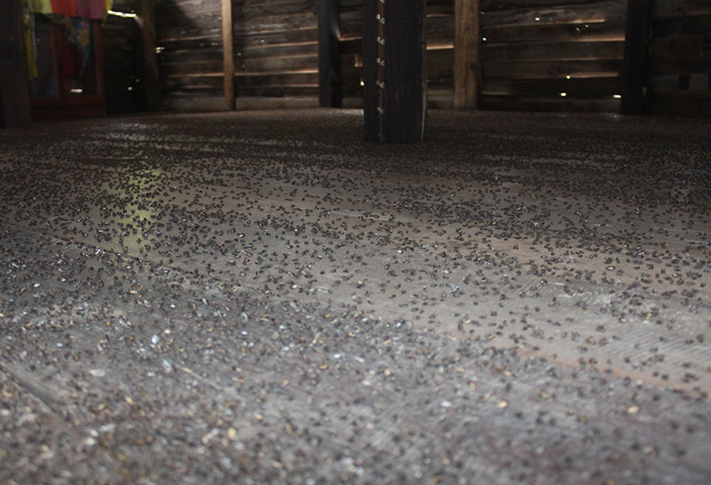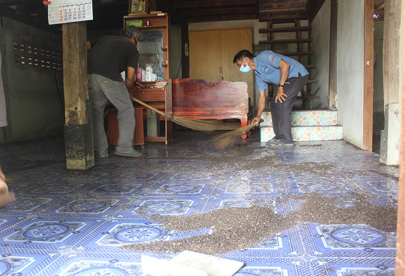 จากการสอบถามนายโทน ถาดครบุรี เจ้าของบ้านหลังดังกล่าว บอกว่า แมลงปีกแข็งหรือด้วงกระเบื้องที่เห็น จะพากันยกทัพเข้ามาที่บ้านเป็นประจำแทบทุกปี ในช่วงที่อากาศร้อนจัดและมีฝนตกต่อเนื่อง โดยในปีนี้แมลงด้วงกระเบื้องเริ่มเข้ามาเมื่อสามวันก่อน จากนั้นก็เพิ่มจำนวนขึ้นเรื่อยๆ จนต้องพาครอบครัวย้ายออกมานอนที่กระท่อมหน้าบ้าน จึงแจ้งเจ้าหน้าที่ให้เข้ามาช่วยจัดการดังกล่าว