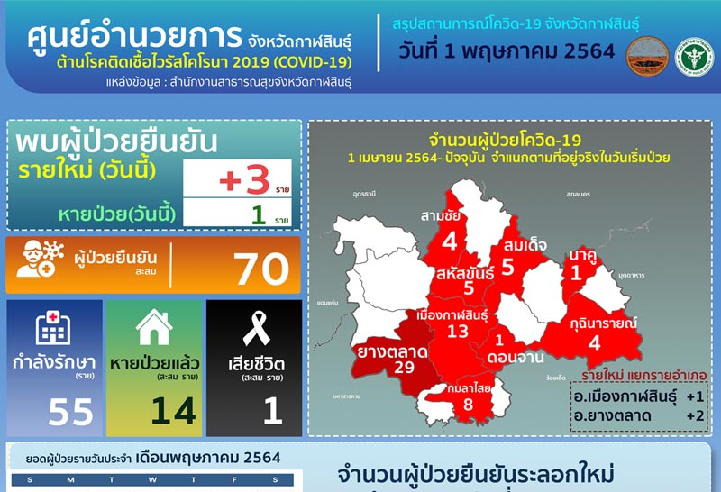 โดยรายที่ 68 เป็นเพศหญิง อายุ 42 ปี อาชีพพนักงานขาย ขณะป่วยอาศัยอยู่ที่ ซอยโคกเวียงพัฒนา ซอยคิงส์อพาร์ทเมนท์ อำเภอเมืองกาฬสินธุ์ มีประวัติเดินทางมาจากพื้นที่ควบคุมสูงสุด จ.พิจิตร, รายที่ 69 เพศชาย อายุ 18 ปี อาชีพค้าขาย และรายที่ 70 เพศชาย อายุ 46 ปี อาชีพรับจ้าง ทั้ง 2 ราย ขณะป่วยอาศัยอยู่ที่ หมู่ที่ 3 ต.ดอนสมบูรณ์ อ.ยางตลาด จ.กาฬสินธุ์ มีประวัติเป็นผู้สัมผัสใกล้ชิดเสี่ยงสูง ผู้ป่วยยืนยัน จ.สมุทรปราการ ผู้สัมผัสใกล้ชิดของผู้ป่วย เจ้าหน้าที่หน่วยปฏิบัติการควบคุมโรคติดต่อ CDCU ได้ทำการสอบสวนโรคและดูแลอย่างใกล้ชิด