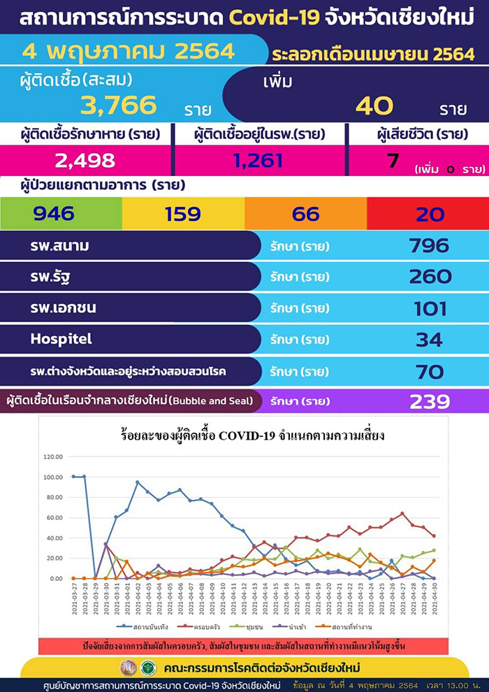 COVID-19 จังหวัดเชียงใหม่วันนี้เพิ่ม 40ราย สะสม 3766 ราย ผู้เสียชีวิตเท่าเดิม 7 ราย