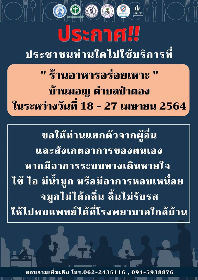 ภูเก็ต แจ้ง ผู้ใช้บริการ ที่ “ร้านอาหารอร่อยเหาะ ” บ้านมอญ ระหว่างวันที่ 18 – 27 เม.ย 2564 ให้เฝ้าสังเกตอาการ