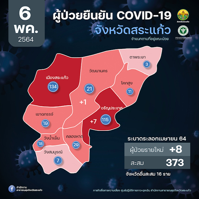 นพ.ประภาส ผูกดวง นายแพทย์สาธารณสุขจังหวัดสระแก้ว เปิดเผยว่า วันนี้ (6 พฤษภาคม 64) จังหวัดสระแก้วมีผู้ติดเชื้อ โควิด-19 รายใหม่ 8 ราย ได้แก่ อำเภออรัญประเทศ 7 ราย และอำเภอวัฒนานคร 1 ราย มาจากระบบเฝ้าระวังในโรงพยาบาลและการคัดกรองเชิงรุกในชุมชน เป็นชาย 4 ราย หญิง 4 ราย อายุระหว่าง 25-54 ปี สัญชาติไทย 3 ราย ชาวกัมพูชา 5 ราย ทำให้การระบาดระลอกใหม่เมษายน 2564 ตั้งแต่วันที่ 4 เมษายน-5 พฤษภาคม 2564 จังหวัดสระแก้วมีผู้ป่วยสะสมทั้งสิ้น 373 ราย เข้ารักษาตัวอยู่ในสถานพยาบาลของรัฐ เอกชน และโรงพยาบาลสนามรวมทั้งสิ้น 138 ราย รักษาหายแล้ว 235 ราย ผู้ป่วยส่วนใหญ่ไม่มีอาการ ร้อยละ 78.9 มีอาการปอดอักเสบ ร้อยละ 17.39 ปอดอักเสบรุนแรง ร้อยละ 2.17 และมีอาการเล็กน้อยร้อยละ 1.45