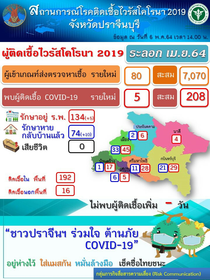 นพ.โชคชัย สาครพานิช นายแพทย์สาธารณสุข จ.ปราจีนบุรี กล่าวว่าวันนี้พบผู้ติดเชื้อไวรัสโคโรนา 2019 รายใหม่ จำนวน 5 ราย เป็นผู้ป่วย สะสมในพื้นที่ 192 ราย นอกพื้นที่เข้ามารักษา 16 ราย ทำให้จังหวัดปราจีนบุรี มีผู้ป่วยสะสม (ระลอกเมษายน2564) ตั้งแต่วันที่ 30 เมษายนถึง 6 พฤษภาคม 2554 จำนวน 208 ราย ได้เข้ารับการรักษาในโรงพยาบาลทุกราย ผู้สัมผัสใกล้ชิดเสี่ยงสูงได้ติดตามตรวจหาเชื้อแล้ว
