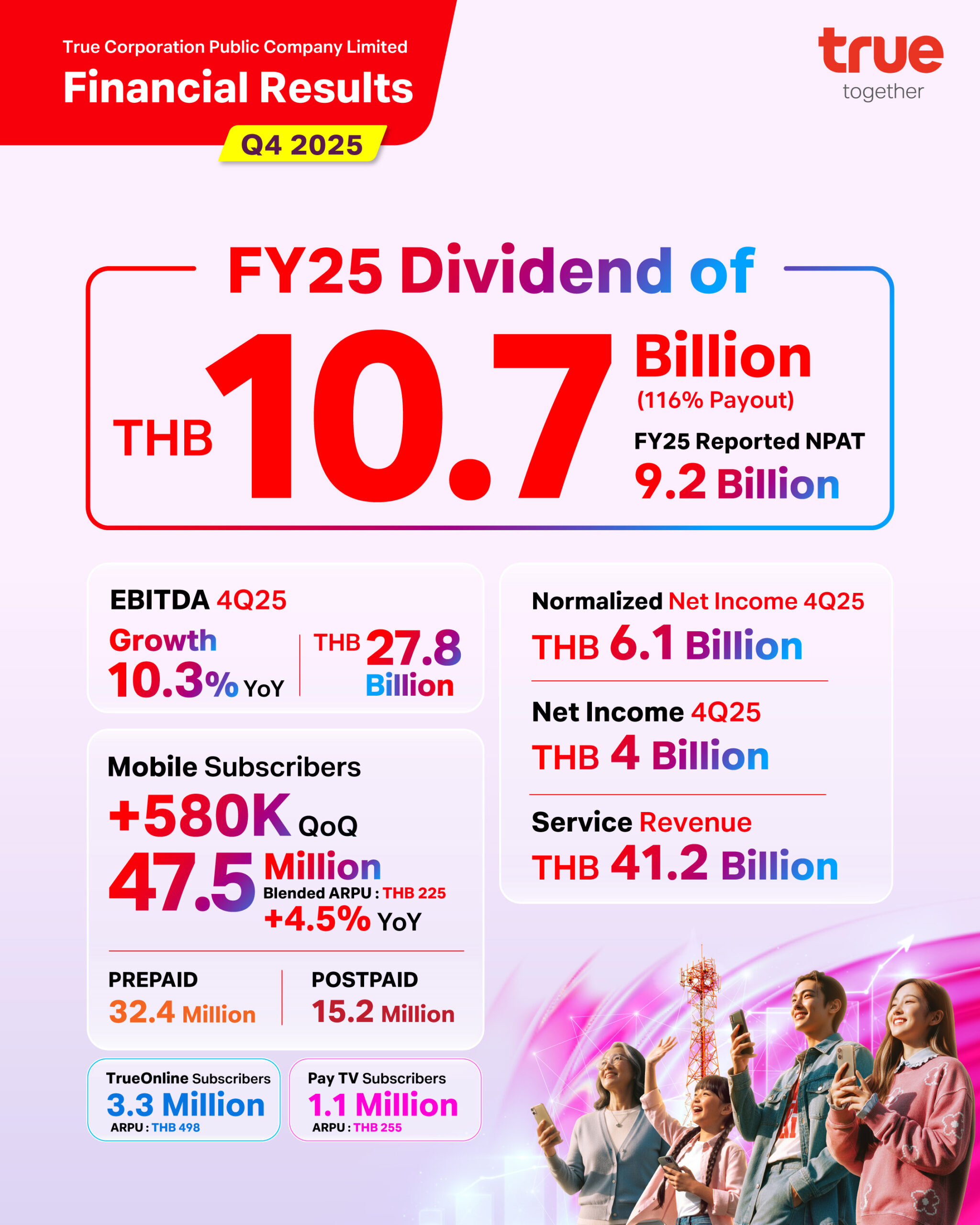 19 กุมภาพันธ์ 2569 – บริษัท ทรู คอร์ปอเรชั่น จำกัด (มหาชน) ประกาศผลการดำเนินงานประจำไตรมาส 4/2568 โดยสามารถทำกำไรสุทธิได้ต่อเนื่องเป็นไตรมาสที่ 4 ติดต่อกัน บริษัทฯ รายงานผลกำไรสุทธิหลังหักภาษีจำนวน 4 พันล้านบาท และกำไรสุทธิหลังปรับปรุงรายการพิเศษ (Normalized Profit) จำนวน 6.1 พันล้านบาท สำหรับ EBITDA ในไตรมาสนี้อยู่ที่ 2.78 หมื่นล้านบาท สะท้อนผลประโยชน์เต็มไตรมาสจากการได้ใบอนุญาตคลื่นความถี่ ทั้งนี้ คณะกรรมการบริษัทฯ มีมติเสนอจ่ายเงินปันผลประจำปีจำนวน 4.1 พันล้านบาท ส่งผลให้เงินปันผลรวมทั้งปีอยู่ที่ 1.07 หมื่นล้านบาท คิดเป็นอัตราการจ่ายเงินปันผล 116% ของ NPAT ตามรายงาน และ 56% ของ NPAT หลังปรับปรุงรายการพิเศษ