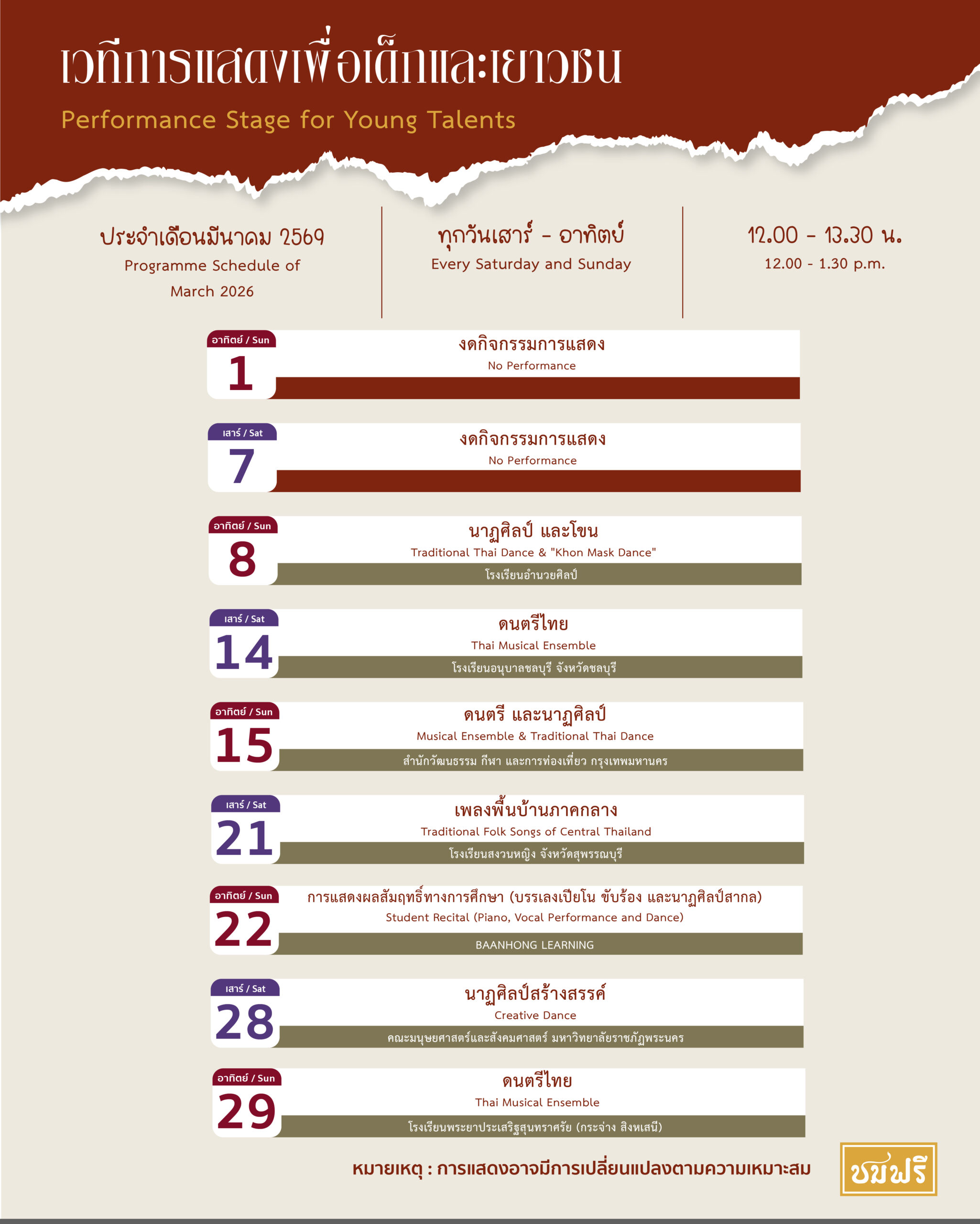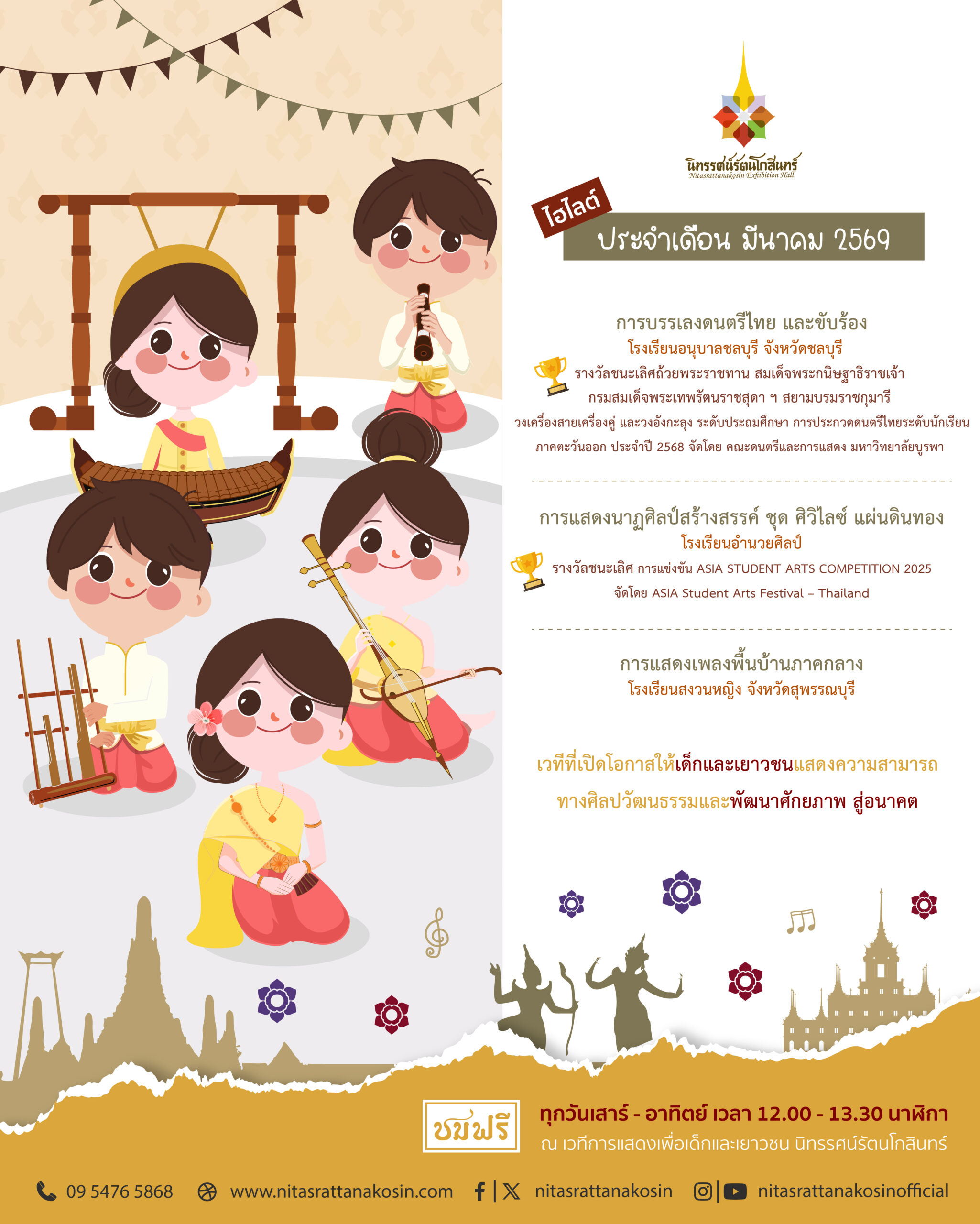 เวทีการแสดงเพื่อเด็กและเยาวชน นิทรรศน์รัตนโกสินทร์ เดือนมีนาคมนี้ พบกับการบรรเลงดนตรีไทย และขับร้อง โดย โรงเรียนอนุบาลชลบุรี จังหวัดชลบุรี รางวัลชนะเลิศถ้วยพระราชทาน สมเด็จพระกนิษฐาธิราชเจ้า กรมสมเด็จพระเทพรัตนราชสุดา ฯ สยามบรมราชกุมารี วงเครื่องสายเครื่องคู่ และวงอังกะลุง ระดับประถมศึกษา การประกวดดนตรีไทยระดับนักเรียนภาคตะวันออก ประจำปี 2568 จัดโดย คณะดนตรีและการแสดง มหาวิทยาลัยบูรพา การแสดงนาฏศิลป์สร้างสรรค์ ชุด ศิวิไลซ์ แผ่นดินทอง โดย โรงเรียนอำนวยศิลป์ รางวัลชนะเลิศ การแข่งขัน ASIA STUDENT ARTS COMPETITION 2025 จัดโดย ASIA Student Arts Festival – Thailand และการแสดงเพลงพื้นบ้านภาคกลาง โดย โรงเรียนสงวนหญิง จังหวัดสุพรรณบุรี ชมฟรี ทุกวันเสาร์ – อาทิตย์ เวลา 12.00 – 13.30 นาฬิกา ข้อมูลเพิ่มเติม www.nitasrattanakosin.com หรือ โทร. 09 5476 5868
