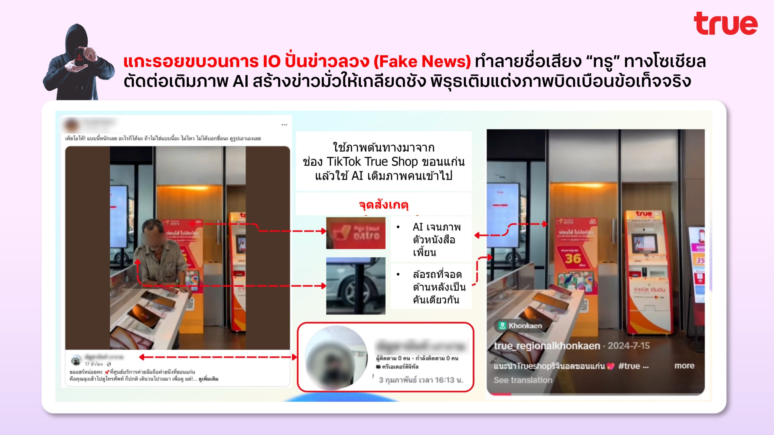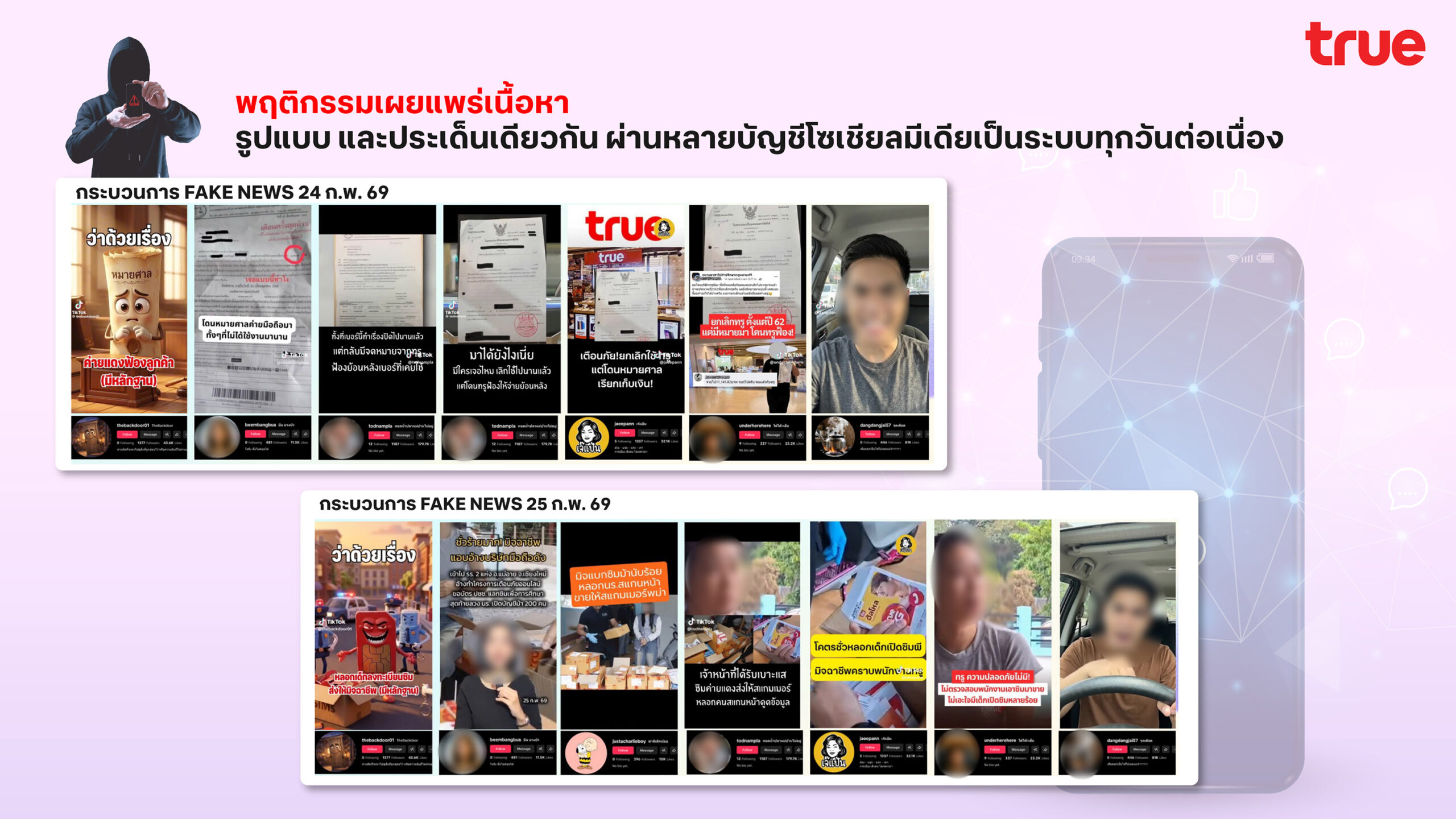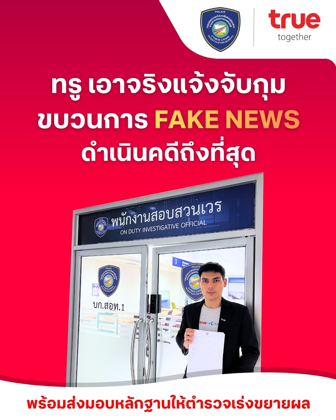 ทรูเอาจริง ล่าตัวมือป่วนบนโซเชียล! เข้าแจ้งความตำรวจไซเบอร์ (บช.สอท.1) ดำเนินคดีกลุ่มบัญชีโซเชียลสร้างเฟคนิวส์ ใช้ AI ผลิตภาพบิดเบือน ให้ข้อมูลเท็จสร้างความเข้าใจผิดกระทบต่อความเชื่อมั่นของสาธารณะ พร้อมส่งมอบหลักฐานเร่งขยายผลเอาผิดผู้กระทำผิดถึงที่สุด