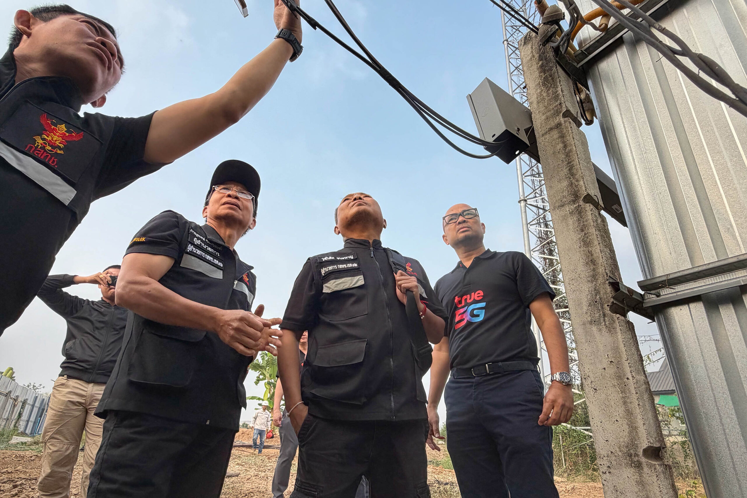 บรรยายภาพ: นายภัคพงศ์ พัฒนมาศ ที่ปรึกษาด้านรัฐกิจสัมพันธ์ บริษัท ทรู คอร์ปอเรชั่น จำกัด (มหาชน) ตัวแทนบริษัทฯ ร่วมกับ พ.ต.ท.ตฤณ ลีลานุช สารวัตรกลุ่มงานสนับสนุนคดีเทคโนโลยี กองบังคับการปราบปรามการกระทำความผิดเกี่ยวกับอาชญากรรมทางเทคโนโลยี (บก.ปอท.) และนายสุธีระ พึ่งธรรม ผู้อำนวยการสำนักกำกับดูแลกิจการโทรคมนาคม สำนักงาน กสทช. ปฏิบัติการกวาดล้างจุดลักลอบส่งสัญญาณเน็ตข้ามแดนไทย-เมียนมา และยึดอุปกรณ์ผิดกฎหมายที่จุดต้องสังสัย ตำบลแม่ตาว อำเภอแม่สอด จังหวัดตาก ภายใต้กรอบกฎหมายที่เกี่ยวข้อง