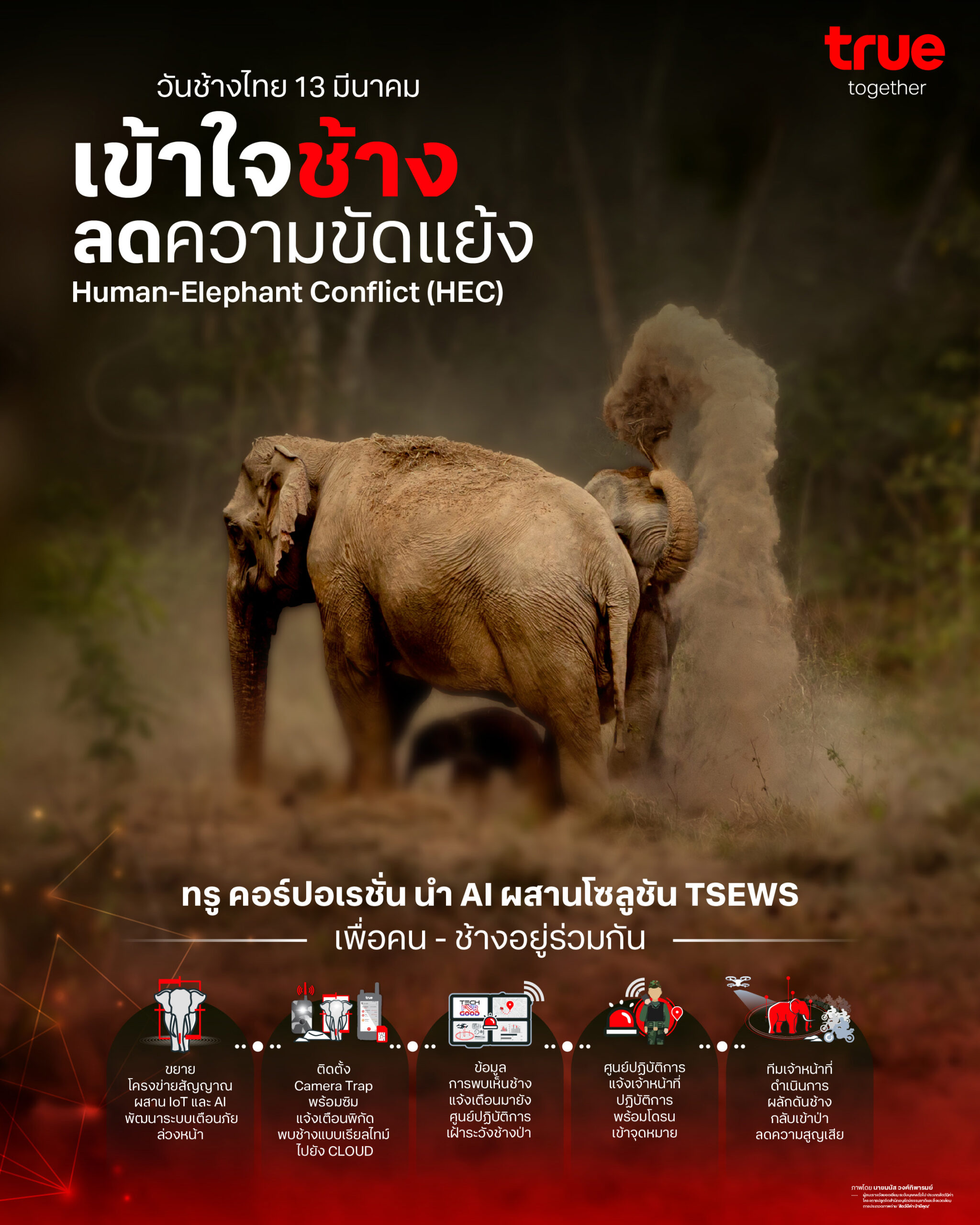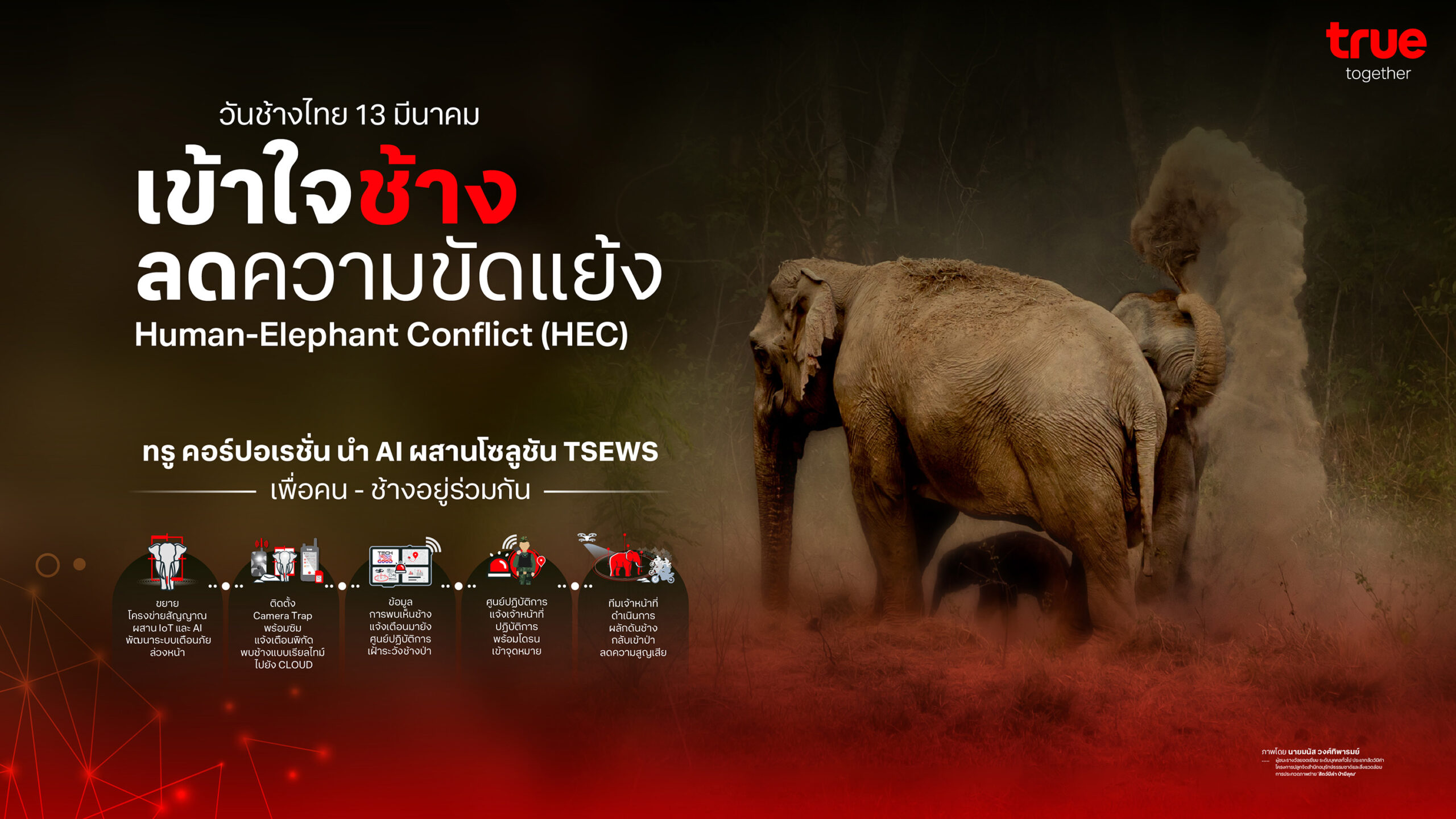 วันช้างไทย 13 มีนาคม ทรู คอร์ปอเรชั่นนำ AI ผสานโซลูชัน TSEWS ส่งเสริมการอยู่ร่วมกันของคนและช้างป่า