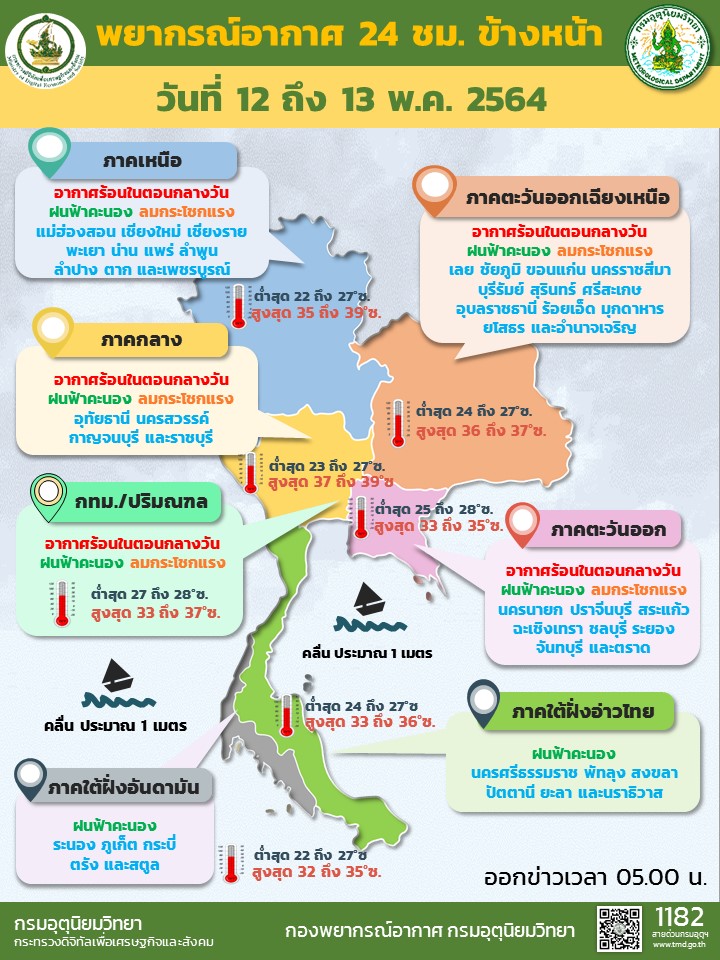 กรมอุตุนิยมวิทยารายงาน พยากรณ์อากาศ 24 ชั่วโมงข้างหน้า บริเวณประเทศไทยตอนบนมี อากาศร้อน ในตอนกลางวัน แต่ยังคงมีฝนฟ้าคะนองและลมกระโชกแรงบางพื้นที่ ทั้งนี้เนื่องจากมีคลื่นกระแสลมฝ่ายตะวันตกเคลื่อนจากประเทศเมียนมาเข้าปกคลุมภาคเหนือตอนบน ในขณะที่มีลมตะวันออกเฉียงใต้ยังคงพัดนำความชื้นจากอ่าวไทยและทะเลจีนใต้เข้ามาปกคลุมภาคตะวันออกเฉียงเหนือตอนล่าง และภาคตะวันออก ส่วนลมตะวันออกและลมตะวันออกเฉียงใต้ยังคงพัดปกคลุมภาคใต้ อ่าวไทย และทะเลอันดามันทำให้ภาคใต้ยังคงมีฝนฟ้าคะนองเกิดขึ้นในระยะนี้