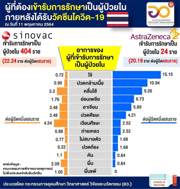 อย่างไรก็ตาม เป็นผู้ที่ได้รับวัคซีนซิโนแวก เท่ากับ 22.24 รายจากผู้ฉีดหนึ่งแสนรายซึ่งมีอาการที่ต้องเข้ารับการรักษาในโรงพยาบาล เรียงตามลำดับ คือ เวียนศีรษะ คลื่นไส้ ปวดศีรษะอาเจียน ผื่น อ่อนเพลีย คัน ผื่นแพ้ ปวดกล้ามเนื้อ ถ่ายเหลว ไม่สบายตัว ไข้ และปวดท้อง และเป็นผู้ที่ได้รับวัคซีนแอสตราซิเนกา เท่ากับ 20.19 รายจากผู้ฉีดหนึ่งแสนราย ซึ่งมีอาการที่ต้องเข้ารับการรักษาในโรงพยาบาล เรียงตามลำดับ คือ ไข้ ปวดกล้ามเนื้อ คลื่นไส้ อ่อนเพลีย อาเจียน ปวดศีรษะ เวียนศีรษะ ถ่ายเหลว ไม่สบายตัว ปวดท้อง คัน และผื่น