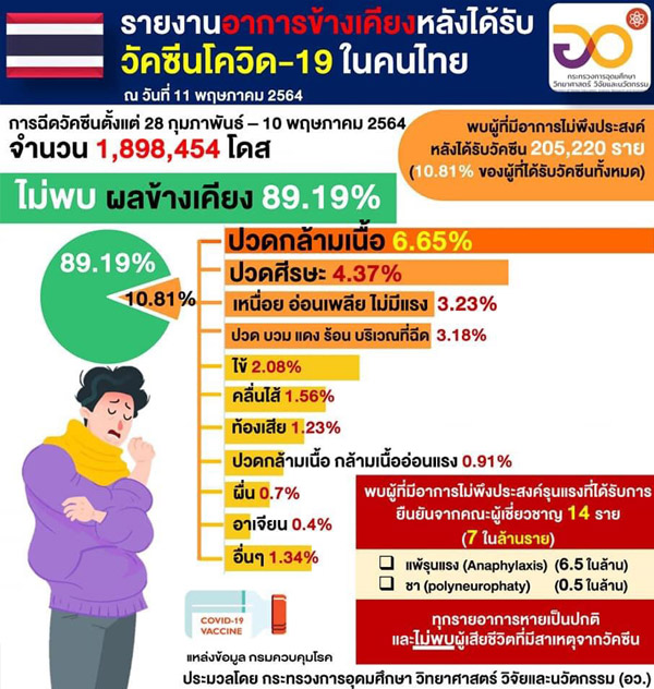 และทั่วโลกอย่างต่อเนื่อง โดยสรุปข้อมูลถึงวันที่ 11 พฤษภาคม 2564 ว่า “ประเทศไทยได้ฉีดวัคซีนโควิด-19 แล้ว จำนวน 1,898,454 โดส โดยมีผู้ที่ได้รับวัคซีนแล้วอย่างน้อยหนึ่งเข็ม 1,365,992 คน หรือเท่ากับ 2.06%