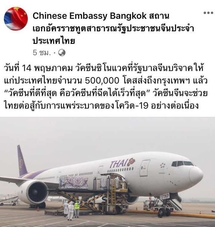 เฟชบุ๊ก Chinese Embassy Bangkok สถานเอกอัครราชทูตสาธารณรัฐประชาชนจีนประจำประเทศไทย โพสต์ข้อความพร้อมภาพระบุว่า วันที่ 14 พฤษภาคม 2564 วัคซีนซิโนแวค ที่รัฐบาลจีน บริจาคให้แก่ประเทศไทย จำนวน 500,000 โดส ส่งถึงกรุงเทพฯ แล้ว “วัคซีนที่ดีที่สุด คือวัคซีนที่ฉีดได้เร็วที่สุด” วัคซีนจีนจะช่วยไทยต่อสู้กับการแพร่ระบาดของโควิด-19 อย่างต่อเนื่อง