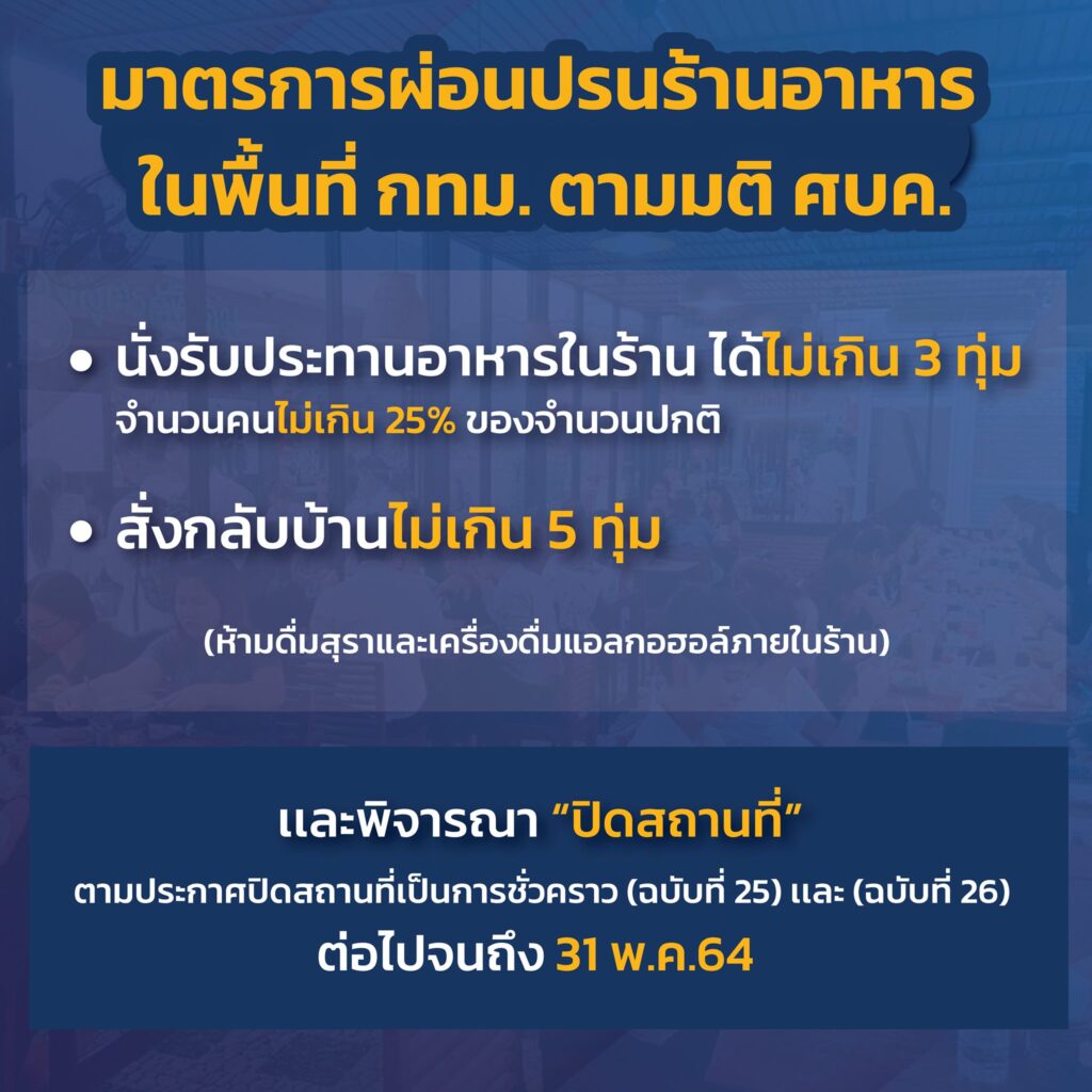 โดยให้ร้านอาหาร สามารถนั่งรับประทานอาหารในร้านได้ ไม่เกิน 21.00 น. และนั่งได้ไม่เกิน 25% ของจำนวนที่นั่งปกติ ส่วนการจำหน่ายอาหารแบบนำไปบริโภคที่อื่นได้ (Take way) จำหน่ายได้ไม่เกิน 23.00 น. และห้ามดื่มสุราหรือเครื่องดื่มแอลกอฮอล์ในร้าน พร้อมเน้นย้ำให้ปฏิบัติตามมาตรการอย่างเคร่งครัดและยังคงปิดสถานที่ตามประกาศกรุงเทพมหานครปิดสถานที่เป็นการชั่วคราว (ฉบับที่ 25) และ (ฉบับที่ 26) ต่อไป