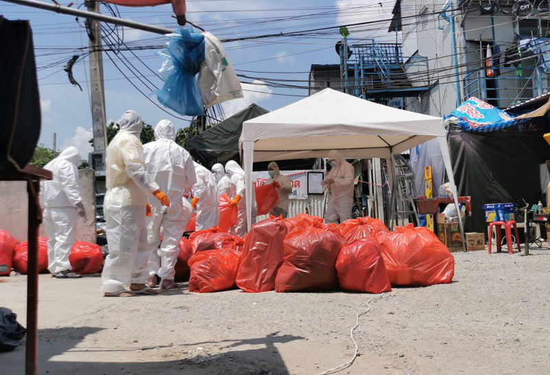 ขณะเดียวกัน ในส่วนของเสบียงอาหาร พบว่าทางบริษัทได้จัดตัวแทนที่สวมชุดป้องกัน PPE ถุงมือ และหน้ากากอนามัย ทำหน้าที่ลำเลียงอาหาร น้ำดื่ม เข้าไปให้คนงานที่อาศัยอยู่ภายใน ส่วนขยะมูลฝอย ที่จากภายในแคมป์ จะถูกคัดแยกใส่ในถุงสีแดง ซึ่งถือเป็นขณะติดเชื้อ เพื่อความปลอดภัยในการนำไปกำจัดต่อไป