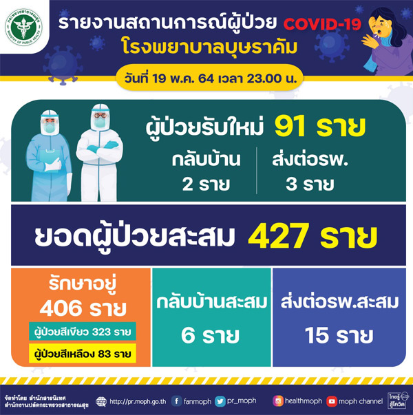 สธ. เผย โรงพยาบาลบุษราคัมดูแลผู้ป่วยโควิด-19 แล้ว 427 ราย หายกลับบ้าน 6 ราย ส่งต่อรักษา 15 ราย ยังอยู่ระหว่างรักษา 406 ราย