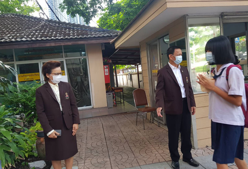 โดยบรรยากาศเป็นไปด้วยความเรียบร้อย นักเรียนทยอยเดินทางมา ซึ่งมาตรการการคัดกรองโควิด-19 ของโรงเรียนได้มีการจัดจุดคัดกรอง วัดอุณหภูมิ ด้านในโรงเรียน และไม่ให้ผู้ปกครองเข้าไปส่งภายในบริเวณโรงเรียน โดยทางโรงเรียนได้มีการจัดจุดให้ผู้ปกครองส่งและคอยบริเวณลานจอดรถหน้าโรงเรียน