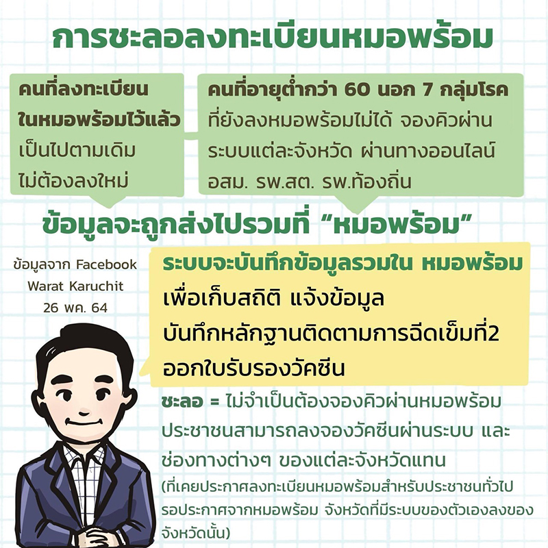 ที่ให้แต่ละจังหวัดช่วยกันให้บริการได้สะดวกต่อผู้ขอรับบริการมากกว่าไม่ได้ให้เลิกลงทะเบียนกับหมอพร้อมนะครับ เพราะหมอพร้อมจะเป็นระบบเก็บสถิติการฉีดวัคซีนของทุกคน แต่ไม่จำเป็นต้อง “จองคิว” ฉีดวัคซีนผ่านหมอพร้อมทุกจังหวัด
