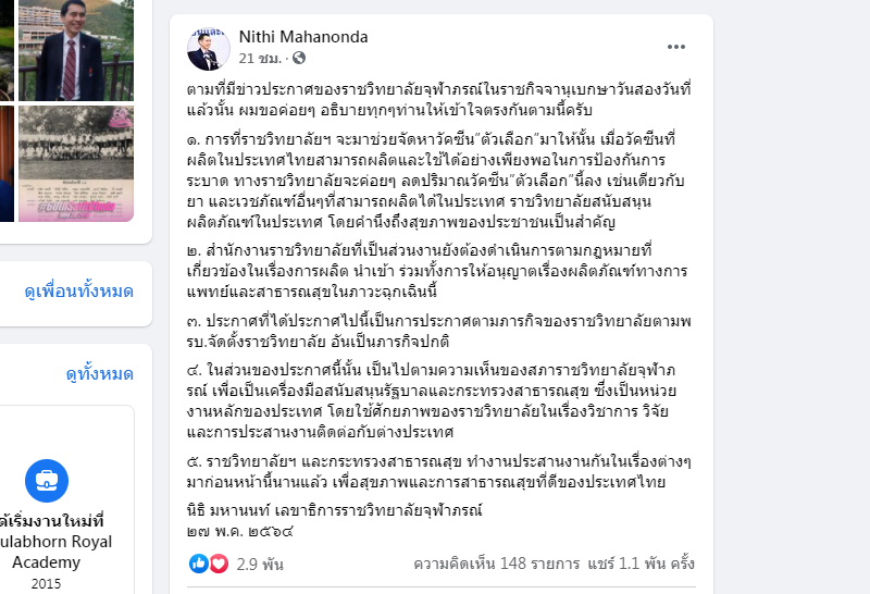ศาสตราจารย์ นพ.นิธิ มหานนท์ เลขาธิการ ราชวิทยาลัยจุฬาภรณ์ โพสต์ผ่านเฟซบุ๊ก “Nithi Mahanonda” ว่า เห็นหนังสือนี้ร่อนไปทั่วบนระบบออนไลน์ โดยที่ คนที่หนังสือนี้ส่งถึงยังไม่ได้เห็นหนังสือตัวเป็นๆเลย อย่างไรก็ดีถึงจะมาพบก็คิดว่าคงไม่ได้พบเหมือนกัน เพราะจากที่พยายามช่วยหาวัคซีน “ตัวเลือก” มาเพิ่มเติมระยะหนึ่งนั้น มีบริษัทหรือกลุ่มคนมากมายที่อ้างว่าเป็นตัวแทนของ วัคซีน โน้นวัคซีนนี้ มากกว่าสิบกลุ่ม ขอเรียนให้คนที่เห็นหนังสือนี้เข้าใจกันตามนี้ครับ
