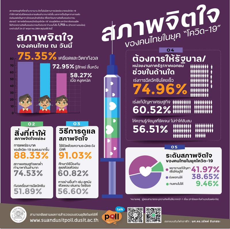 สวนดุสิตโพล มหาวิทยาลัยสวนดุสิต สำรวจความคิดเห็นของประชาชนทั่วประเทศ จำนวนทั้งสิ้น 1,713 คน เรื่อง “สภาพจิตใจของคนไทยในยุคโควิด-19” ระหว่างวันที่ 24-27 พฤษภาคม 2564 พบว่าร้อยละ 75.35 ระบุ เครียดและวิตกกังวลที่มีโควิด-19 ระบาด รอลงมาร้อยละ 72.95 ระบุ รู้สึกแย่สิ้นหวัง ร้อยละ 58.27 ระบุ เบื่อ หงุดหงิด ร้อยละ 45.19 ระบุ กลัว หวาดผวา