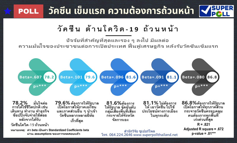 ความมั่นใจต่อการได้ใช้ชีวิตปกติ เช่น เดินทาง ทำงาน ทำธุรกิจ ช้อปปิ้งจับจ่ายใช้สอย หลังได้รับวัคซีนโควิด-19 ถ้วนหน้า (beta = .607) รองลงมาคือ ความต้องการให้รัฐบาลเปิดโอกาสให้ภาคเอกชน และภาคส่วนอื่น ๆ นำเข้าวัคซีนหลากหลายยี่ห้อเร็วที่สุด (beta = .101) ความต้องการให้รัฐบาล จัดอันดับกลุ่มเสี่ยงพื้นที่เสี่ยงกระจายให้จังหวัดจัดการเอง (beta = .096) ไม่ต้องการให้เอาวัคซีนหาผลประโยชน์ทางการเมือง (beta = .091)