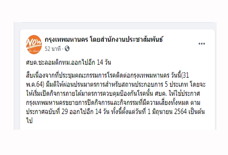 เมื่อเวลา 19.30 น. สำนักประชาสัมพันธ์ กรุงเทพมหานคร(กทม.) แจ้งว่าสืบเนื่องจากที่ประชุมคณะกรรมการโรคติดต่อกรุงเทพมหานคร ครั้งที่ 15/2564 วันนี่(31 พ.ค.64) มีมติให้ผ่อนปรนมาตรการสำหรับสถานประกอบการ 5 ประเภท โดยจะให้เริ่มเปิดกิจการภายใต้มาตรการควบคุมป้องกันโรคนั้น