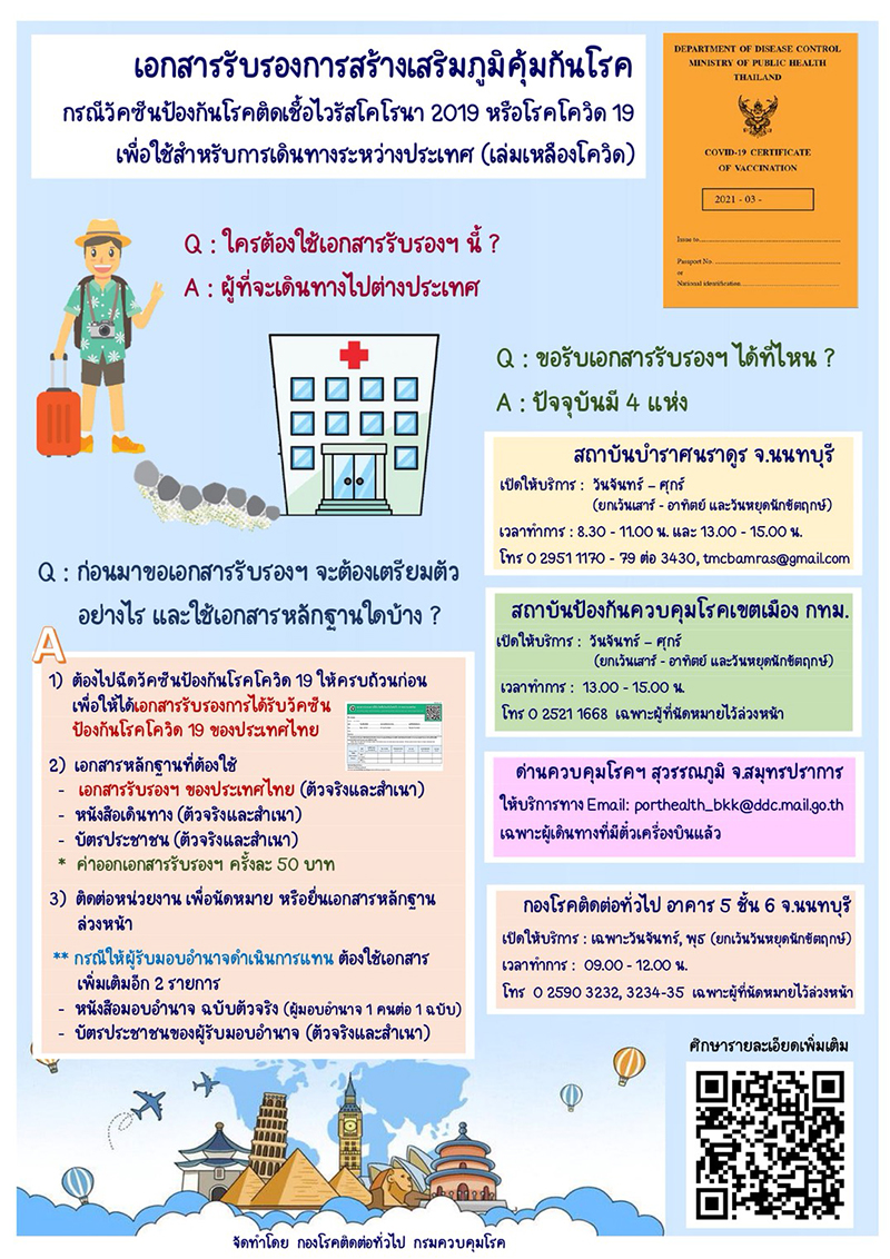 อย่างไรก็ตาม ปัจจุบันสามารถขอหนังสือรับรองฯ ได้ที่ 4 หน่วยงานในสังกัดกรมควบคุมโรค กระทรวงสาธารณสุข ได้แก่ 1.สถาบันบำราศนราดูร จังหวัดนนทบุรีโทร 02-951-1170 ถึง 79 ต่อ 3430 2.สถาบันป้องกันควบคุมโรคเขตเมือง (สปคม.) กรุงเทพฯ โทร 02-521-1668 3.ด่านควบคุมโรคติดต่อระหว่างประเทศ ท่าอากาศยานสุวรรณภูมิ จังหวัดสมุทรปราการ อีเมล [email protected] และ 4.กองโรคติดต่อทั่วไป อาคาร 5 ชั้น 6 กรมควบคุมโรค จังหวัดนนทบุรี โทร 02-590-3232, 02-590-3234 ถึง 35 หรืออีเมล [email protected] โดยติดต่อไปยังหน่วยงานข้างต้น เพื่อนัดหมาย หรือยื่นเอกสารหลักฐานล่วงหน้า สอบถามเพิ่มเติมได้ที่สายด่วนกรมควบคุมโรค โทร.1422