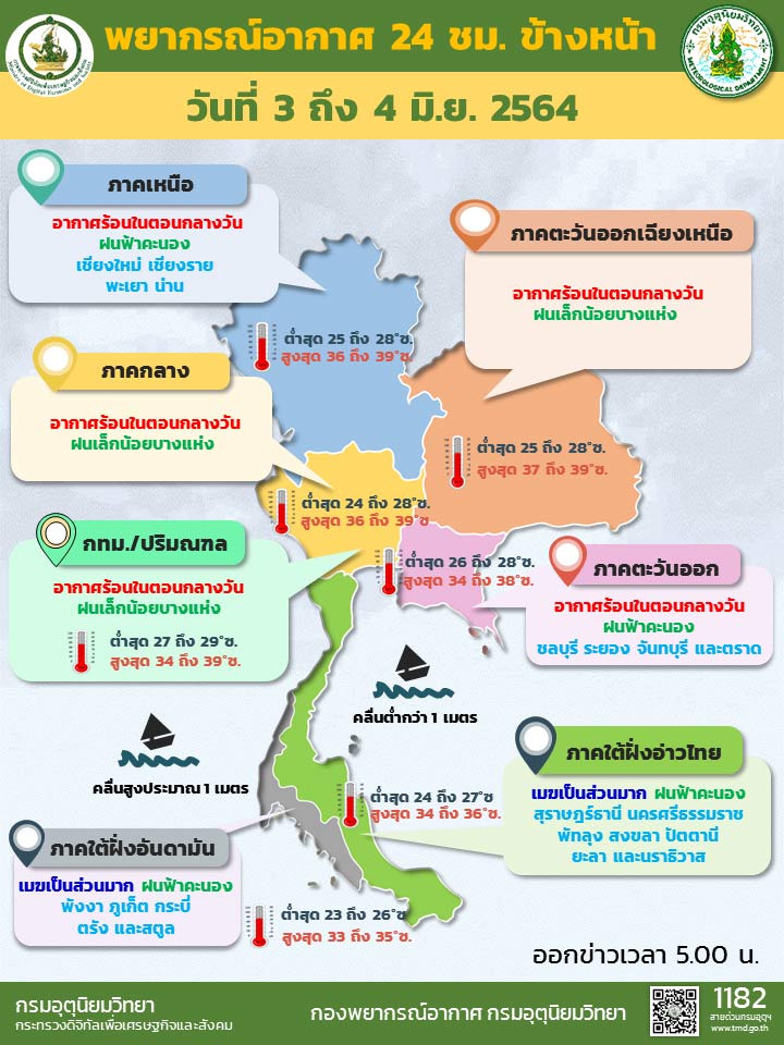 ทะเลมีคลื่นสูงประมาณ 1 เมตร บริเวณที่มีฝนฟ้าคะนองคลื่นสูง 1-2 เมตร