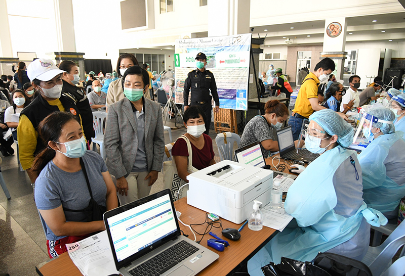 นางวัลยา วัฒนรัตน์ รองปลัดกรุงเทพมหานคร ลงพื้นที่ตรวจเยี่ยมการให้บริการฉีดวัคซีน เข็มที่ 2 แก่ประชาชนในชุมชนที่มีการระบาดในพื้นที่เขตปทุมวัน พร้อมให้กำลังใจบุคลากรทางการแพทย์ที่ปฏิบัติหน้าที่ โดยมี นางมาศวัลย์ ปิ่นสุวรรณ ผู้อำนวยการเขตปทุมวัน พร้อมด้วยคณะผู้บริหารเขตปทุมวัน เจ้าหน้าที่ศูนย์บริการสาธารณสุขที่เกี่ยวข้อง ร่วมลงพื้นที่และรายงานข้อมูล ณ บริเวณสนามโปโล ฟุตบอล พาร์ค และ วัดพระมหาไถ่ เขตปทุมวัน
