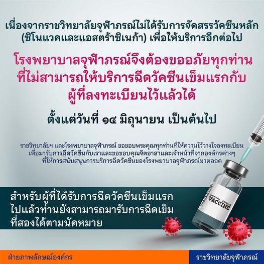 ราชวิทยาลัยจุฬาภรณ์ ไม่ได้รับการจัดสรรวัคซีนหลัก (ซิโนแวคและแอสตร้าซิเนก้า) เพื่อให้บริการอีกต่อไป โรงพยาบาลจุฬาภรณ์จึงต้องขออภัยทุกท่านที่ไม่สามารถให้บริการฉีดวัคซีนเข็มแรกกับผู้ที่ลงทะเบียนไว้แล้วได้ ตั้งแต่วันที่ 14 มิถุนายน เป็นต้นไป ทั้งนี้รวมถึงสถานศึกษา และหน่วยงานของรัฐที่ติดต่อเพื่อขอรับการฉีดวัคซีนหลักทั้งสองชนิดด้วย