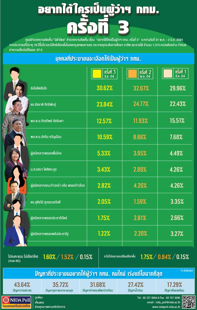 “นิด้าโพล” สถาบันบัณฑิตพัฒนบริหารศาสตร์ (นิด้า) เผยผลสำรวจความคิดเห็นประชาชนที่มีอายุ 18 ปีขึ้นไป และมีสิทธิเลือกตั้งในกรุงเทพมหานคร จำนวน 1,313 หน่วยตัวอย่าง เรื่อง “อยากได้ใครเป็นผู้ว่าฯ กทม. ครั้งที่ 3” ทำการสำรวจระหว่าง วันที่ 31 พฤษภาคม – 2 มิถุนายน 2564