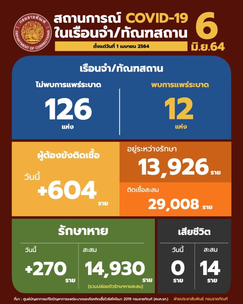 นายอายุตม์ สินธพพันธุ์ อธิบดีกรมราชทัณฑ์ เผยสถานการณ์การแพร่ระบาดของโรคติดเชื้อไวรัสโควิด-19 ในเรือนจำและทัณฑสถาน ข้อมูล ณ วันที่ 5 มิถุนายน 2564 เวลา 16.00 น. ว่ามีผู้ต้องขังติดเชื้อรายใหม่ จำนวน 604 ราย รักษาหายเพิ่ม 270 ราย ทำให้มีผู้ต้องขังติดเชื้อที่ยังอยู่ในการดูแลของกรมราชทัณฑ์ 13,926 ราย แพร่ระบาดในเรือนจำ/ทัณฑสถาน จำนวน 12 แห่ง