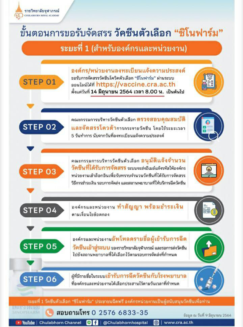 ราชวิทยาลัยจุฬาภรณ์ เปิดจอง “ซิโนฟาร์ม” 14 มิ.ย. นำเข้าลอตแรก 1 ล้านโดส 20 มิ.ย.- ดีเดย์เริ่มฉีด 25 มิ.ย.นี้