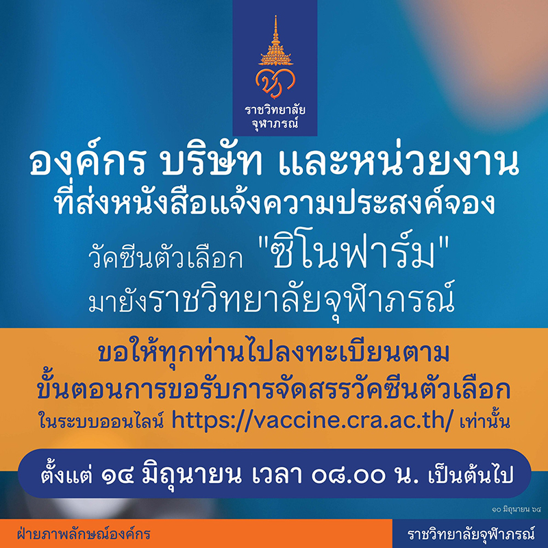 ราชวิทยาลัยจุฬาภรณ์ เปิดจอง “ซิโนฟาร์ม” 14 มิ.ย. นำเข้าลอตแรก 1 ล้านโดส 20 มิ.ย.- ดีเดย์เริ่มฉีด 25 มิ.ย.นี้
