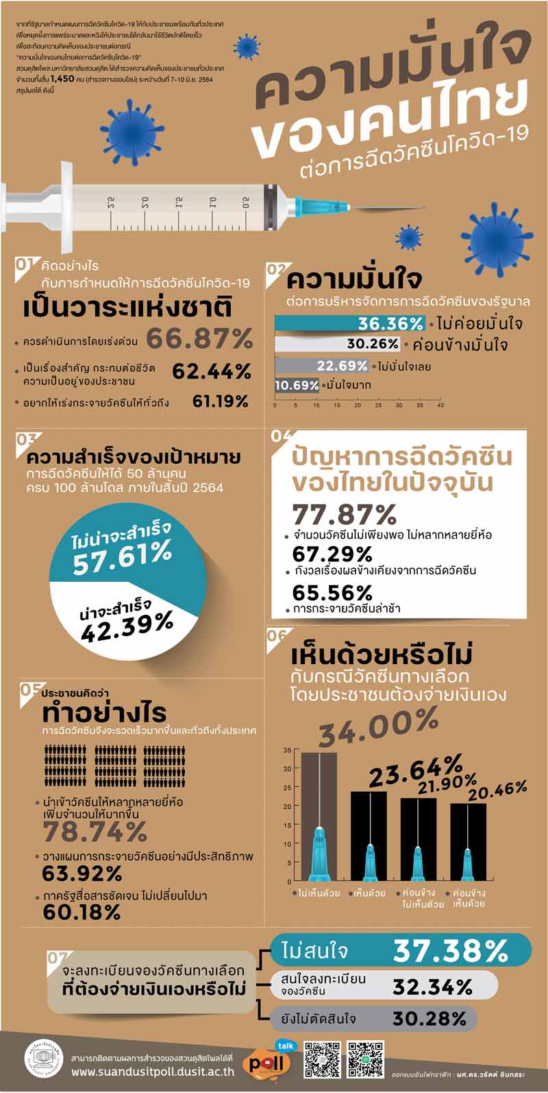 สวนดุสิตโพล มหาวิทยาลัยสวนดุสิต เผยผลสำรวจความคิดเห็นประชาชนทั่วประเทศจำนวน ทั้งสิ้น 1,450 คน เรื่อง “ความมั่นใจของคนไทยต่อการฉีดวัคซีนโควิด-19”