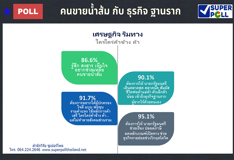 ซูเปอร์โพล 86.6% รู้สึกสงสาร เห็นใจ อยากช่วยเหลือ คนขายน้ำส้ม ขณะ 95.1% จี้นายกฯช่วยเรื่อง ปลอดภาษี ลดหลักเกณฑ์เปิดทาง ช่วยธุรกิจรายย่อย