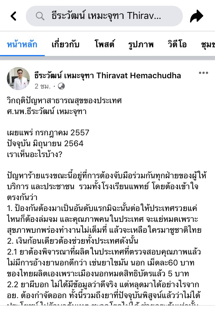 นพ.ธีระวัฒน์ เหมะจุฑา หัวหน้าศูนย์วิทยาศาสตร์สุขภาพโรคอุบัติใหม่ คณะแพทยศาสตร์ จุฬาลงกรณ์ โพสต์ข้อความในเพจเฟซบุ๊ก เรื่องวิกฤตปัญหา สาธารณสุข ของประเทศ ที่เผยแพร่ กรกฎาคม 2557 ปัจจุบัน มิถุนายน 2564 เราเห็นอะไรบ้าง ว่า ปัญหาร้ายแรงขณะนี้อยู่ที่การต้องจับมือร่วมกันทุกฝ่ายของผู้ให้บริการ และประชาชน รวมทั้งโรงเรียนแพทย์ โดยต้องเข้าใจตรงกันว่า