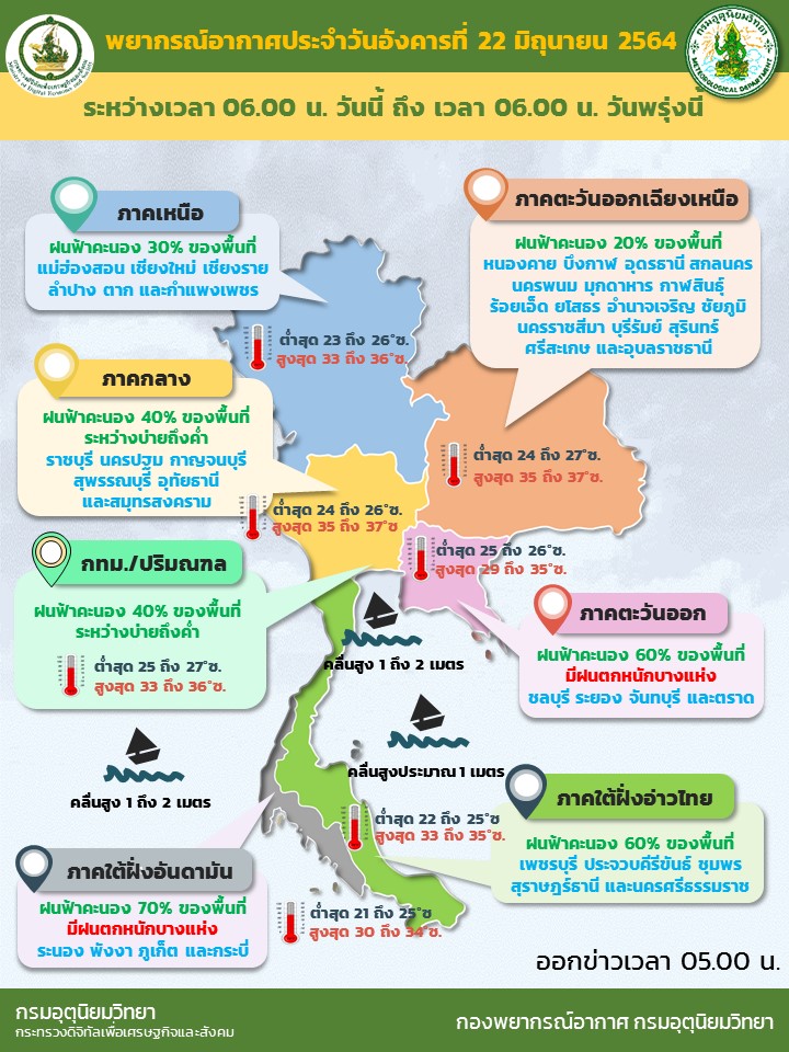 กรมอุตุนิยมวิทยา รายงานพยากรณ์อากาศ 24 ชั่วโมงข้างหน้า มรสุมตะวันตกเฉียงใต้กำลังปานกลางพัดปกคลุมทะเลอันดามัน ประเทศไทย และอ่าวไทย ลักษณะเช่นนี้ทำให้ด้านรับมรสุมของภาคกลาง ภาคตะวันออก และภาคใต้ ยังคงมีฝนฟ้าคะนองเกิดขึ้น กับมีฝนตกหนักบางแห่งบริเวณภาคตะวันออกและภาคใต้ฝั่งตะวันตก