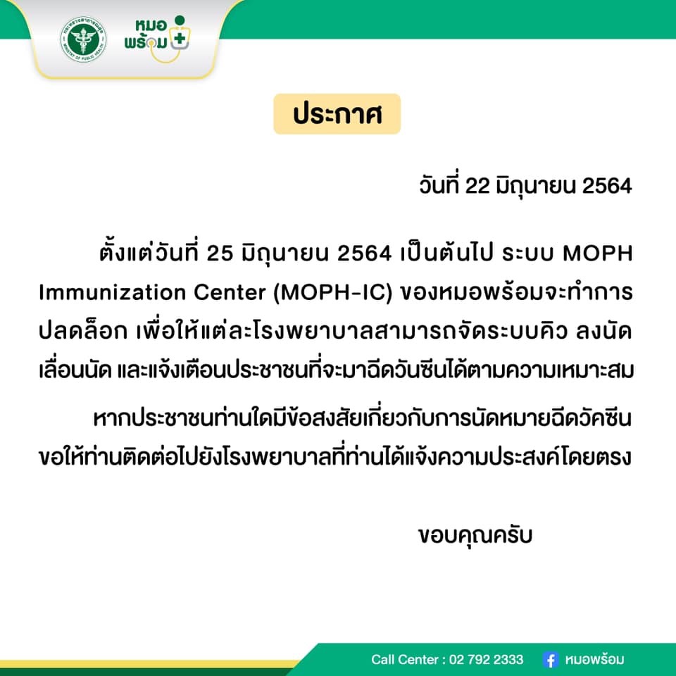 หมอพร้อม ประกาศผ่านเฟซบุ๊ก โดยระบุว่าตั้งแต่วันที่ 25 มิถุนายน 2564 เป็นต้นไป ระบบ MOPH Immunization Center (MOPH-IC) ของหมอพร้อมจะทำการปลดล็อก เพื่อให้แต่ละโรงพยาบาลสามารถจัดระบบคิว ลงนัด เลื่อนนัด และแจ้งเตือนประชาชนที่จะมาฉีดวันซีนได้ตามความเหมาะสม