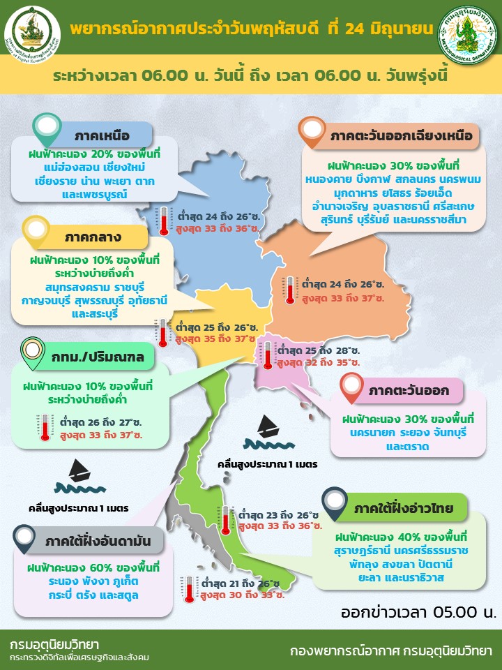 อุณหภูมิสูงสุด 33-37 องศาเซลเซียสลมตะวันตกเฉียงใต้ ความเร็ว 10-20 กม./ชม.