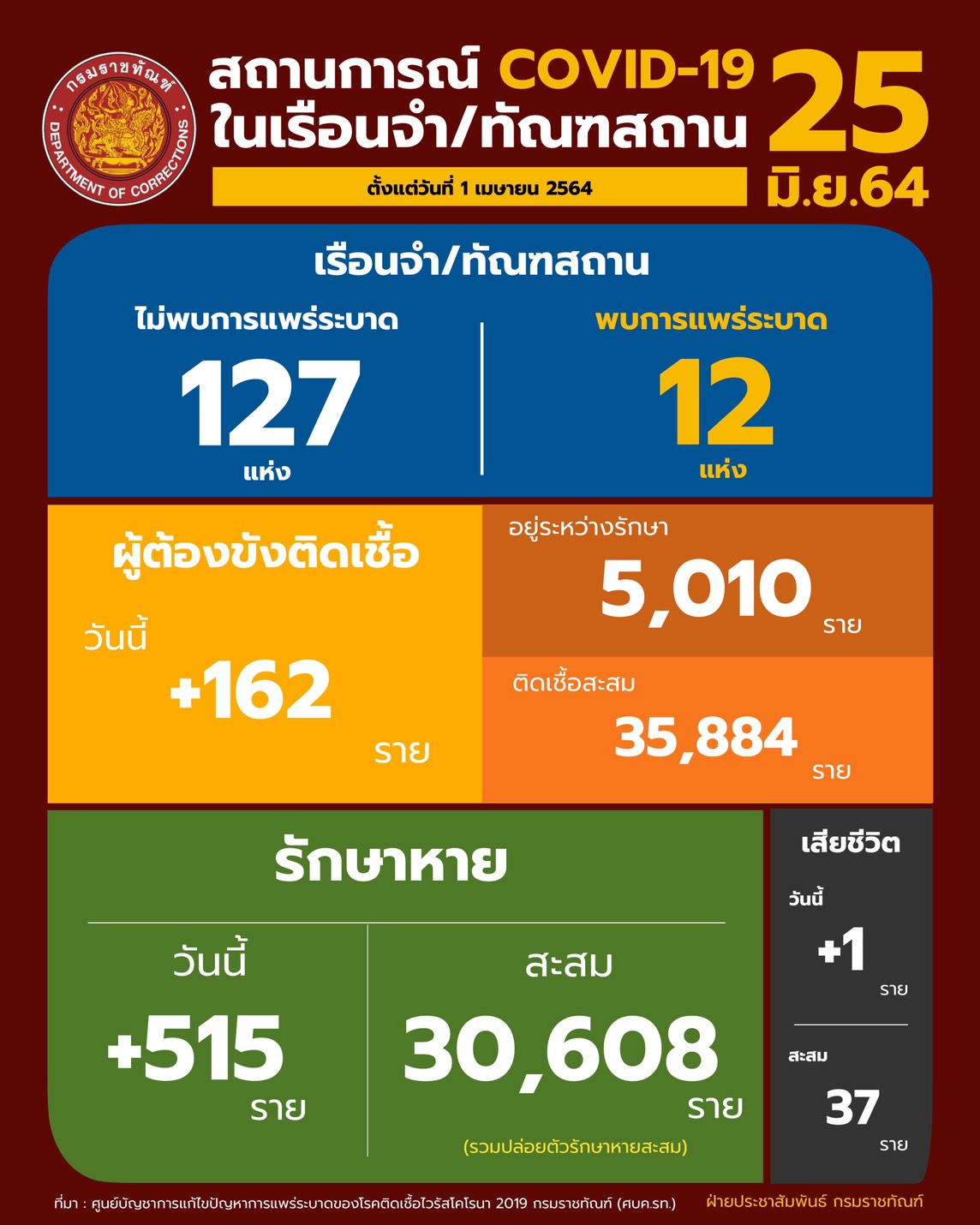 นายอายุตม์ สินธพพันธุ์ อธิบดีกรมราชทัณฑ์ เผยสถานการณ์การแพร่ระบาดของโรคติดเชื้อไวรัสโควิด-19 ในเรือนจำและทัณฑสถาน (ข้อมูล 24 มิ.ย.64 เวลา 16.00 น.) มีผู้ต้องขังติดเชื้อรายใหม่ จำนวน 162 ราย รักษาหายวันนี้ 515 ราย เสียชีวิต 1 ราย ทำให้มีผู้ต้องขังติดเชื้อที่ยังอยู่ในการดูแลของกรมราชทัณฑ์ 5,010 ราย สถานการณ์การแพร่ระบาดในวันนี้ มีเรือนจำสีขาวที่ไม่พบการแพร่ระบาดคงที่ จำนวน 127 แห่ง
