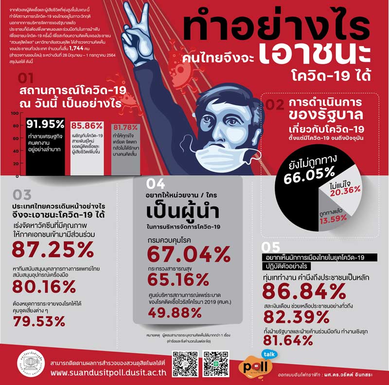 “สวนดุสิตโพล” มหาวิทยาลัยสวนดุสิต สำรวจความคิดเห็นของประชาชนทั่วประเทศ จำนวนทั้งสิ้น 1,744 คน เรื่อง ทำอย่างไร คนไทยจึงจะเอาชนะโควิด-19 ได้ ระหว่างวันที่ 28 มิถุนายน – 1 กรกฎาคม 2564