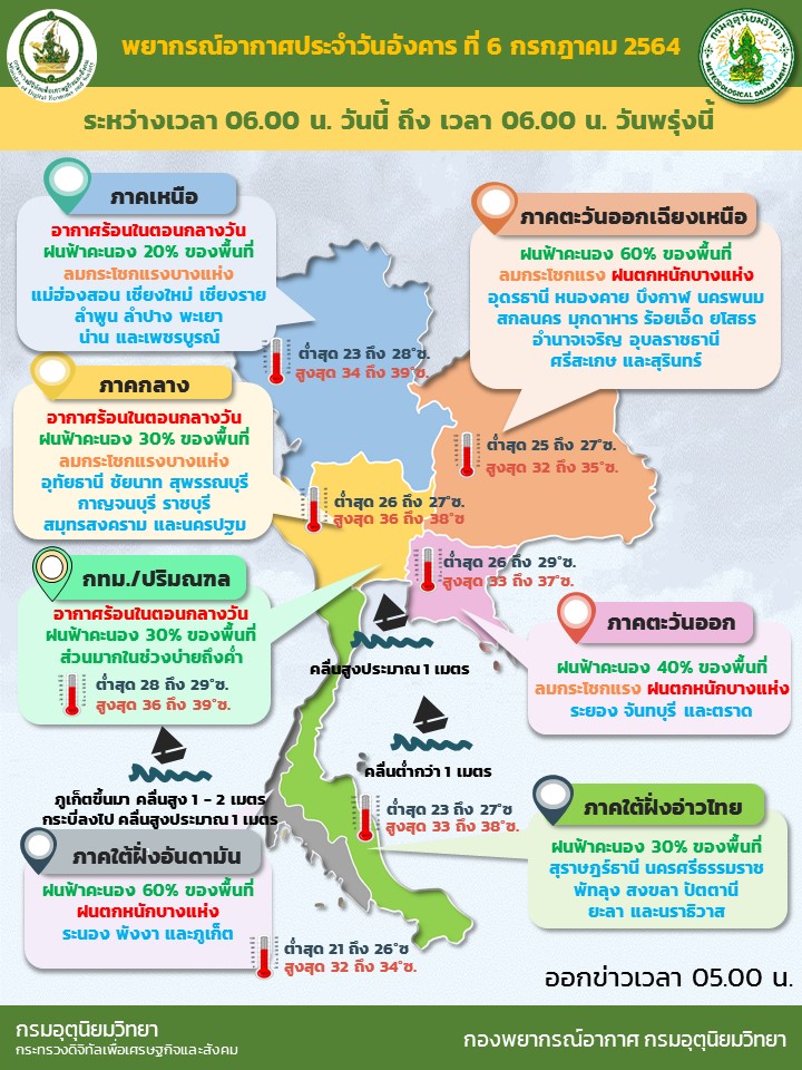 กรมอุตุนิยมวิทยา รายงานลักษณะอากาศทั่วไป พยากรณ์อากาศ 24 ชั่วโมงข้างหน้า มรสุมตะวันตกเฉียงใต้ที่พัดปกคลุมทะเลอันดามัน ประเทศไทย และอ่าวไทย เริ่มมีกำลังแรงขึ้น ประกอบกับร่องมรสุมพาดผ่านตอนบนของภาคเหนือและภาคตะวันออกเฉียงเหนือ เข้าสู่หย่อมความกดอากาศต่ำกำลังแรงปกคลุมบริเวณทะเลจีนใต้ตอนกลาง ทำให้บริเวณประเทศไทยมีฝนเพิ่มมากขึ้น โดยมีฝนตกหนักบางแห่ง