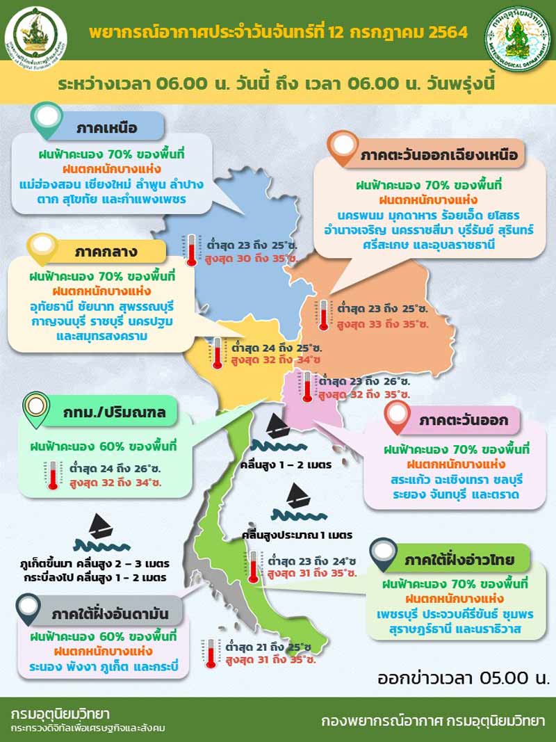 ส่วนอ่าวไทยตอนบนมีคลื่นสูง 1-2 เมตร บริเวณที่มีฝนฟ้าคะนองคลื่นสูงมากกว่า 2 เมตร ขอให้ชาวเรือบริเวณทะเลอันดามันและอ่าวไทยตอนบนระมัดระวังอันตรายในการเดินเรือบริเวณที่มีฝนฟ้าคะนอง และเรือเล็กบริเวณทะเลอันดามันตอนบนควรงดออกจากฝั่งอีก 1 วัน (12 ก.ค. 64)