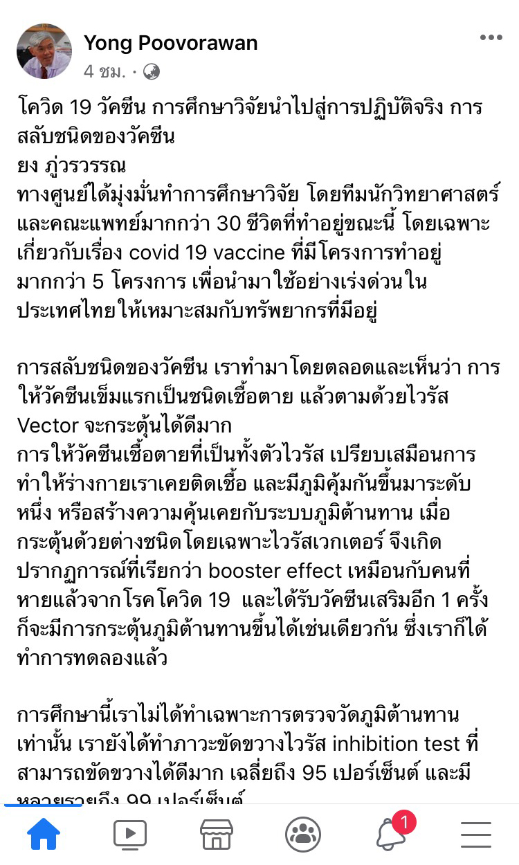 ศ.นพ.ยง ภู่วรวรรณ หัวหน้าศูนย์เชี่ยวชาญเฉพาะทางด้านไวรัสวิทยาคลินิก ภาควิชากุมารเวชศาสตร์ คณะแพทยศาสตร์ จุฬาลงกรณ์มหาวิทยาลัย โพสต์เฟซบุ๊ก เรื่อง โควิด-19 วัคซีน การศึกษาวิจัยนำไปสู่การปฏิบัติจริง การสลับชนิดของวัคซีนว่า ทางศูนย์ฯ ได้มุ่งมั่นทำการศึกษาวิจัย โดยทีมนักวิทยาศาสตร์และคณะแพทย์มากกว่า 30 ชีวิตที่ทำอยู่ขณะนี้ โดยเฉพาะเกี่ยวกับเรื่อง covid 19 vaccine ที่มีโครงการทำอยู่มากกว่า 5 โครงการ เพื่อนำมาใช้อย่างเร่งด่วนในประเทศไทยให้เหมาะสมกับทรัพยากรที่มีอยู่