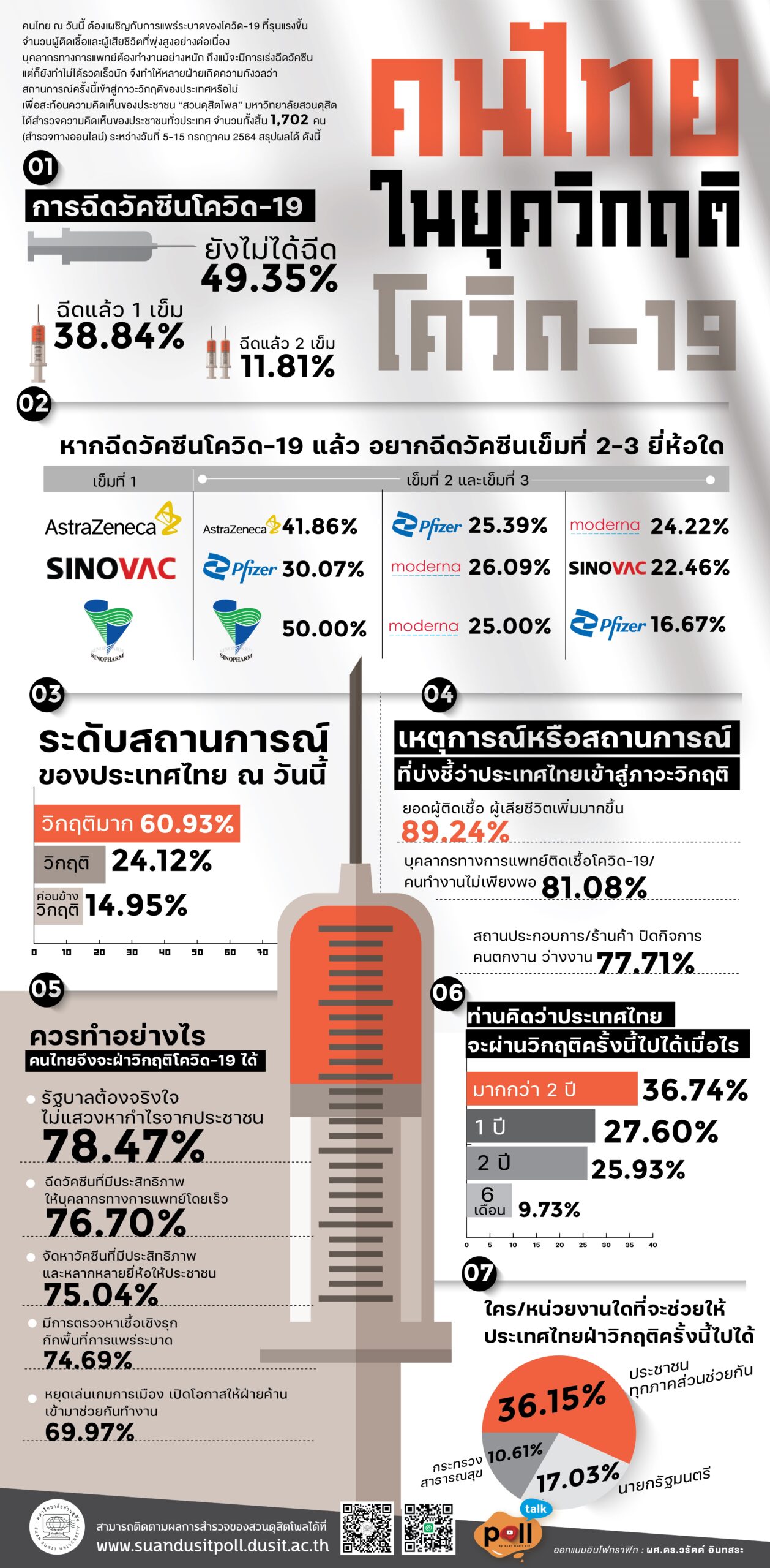 สวนดุสิตโพลชี้ไทยวิกฤตยอดติดเชื้อเพิ่มสูง จี้รัฐบาลจริงใจช่วยประชาชน ขณะ 49.35% ยังไม่ฉีดวัคซีน